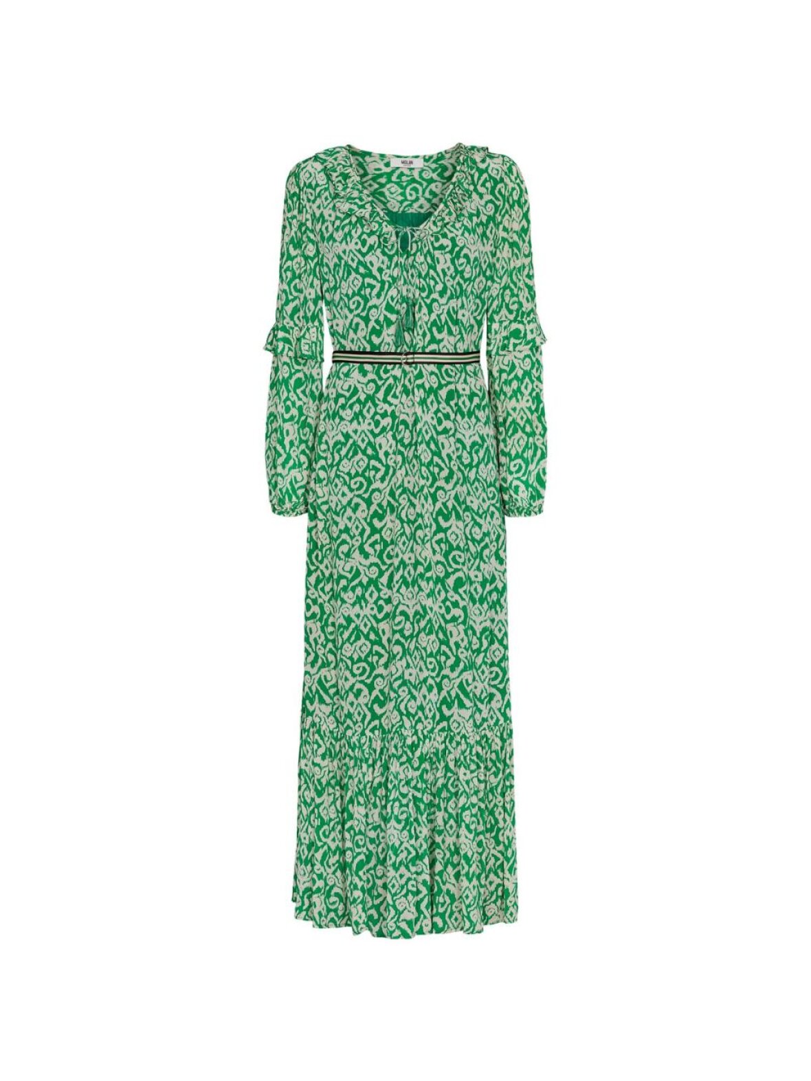 Smuk kjole fra Moliin Copenhagen. Kjolen har v-udskæring med bindebånd, designet med flæser både ved ærmerne, skørtet og hals. Kjolen har et smukt bælte ved taljen, som skaber en fin kontrast med det bløde look, kjolen giver og det seje bælte, som træder frem. Ærmerne har ribkant og kan strækkes ud.
