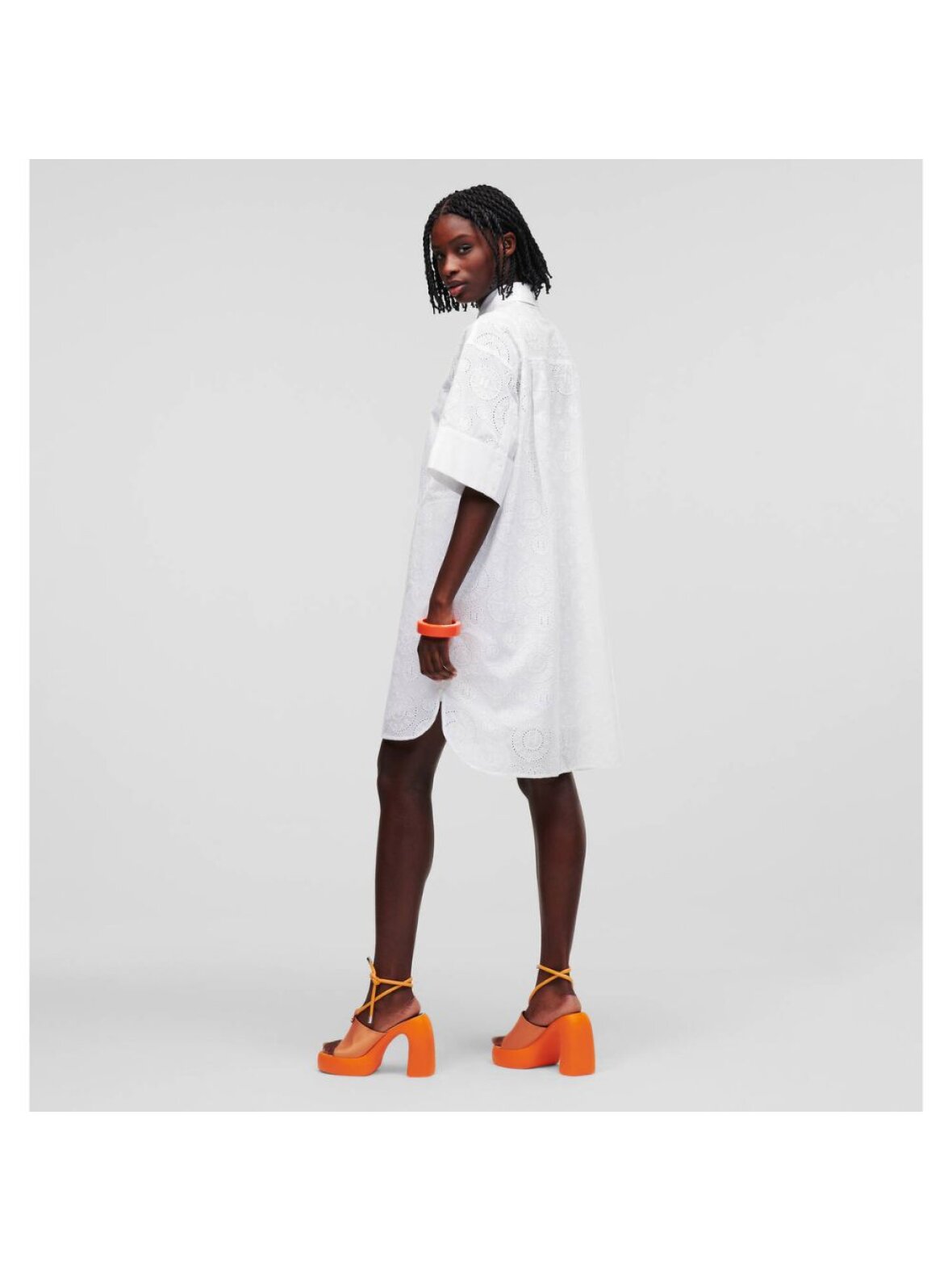 Smuk kjole fra Karl Lagerfeld. Er designet broderi anglaise, brede ærmer, slidser i siderne, knappelukning, høj krave. Style den med bare ben og stiletter for det perfekte look til en begivenhed.
