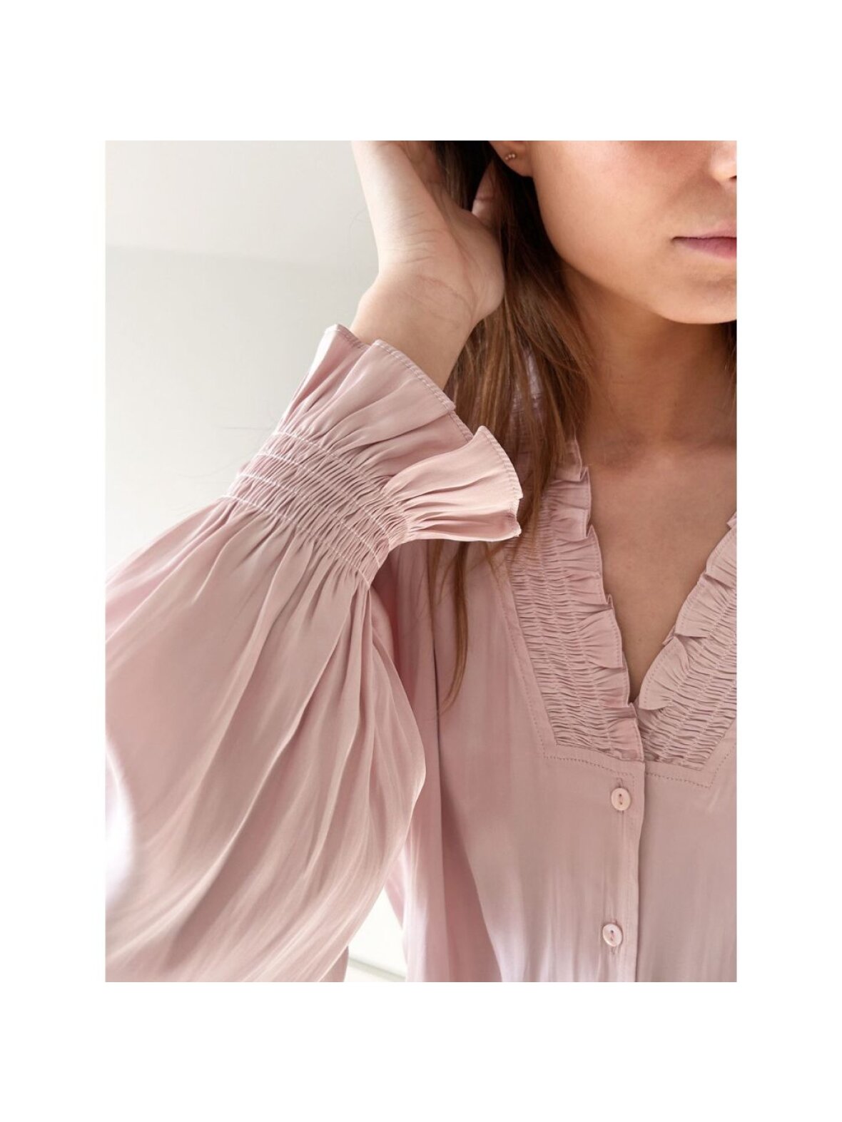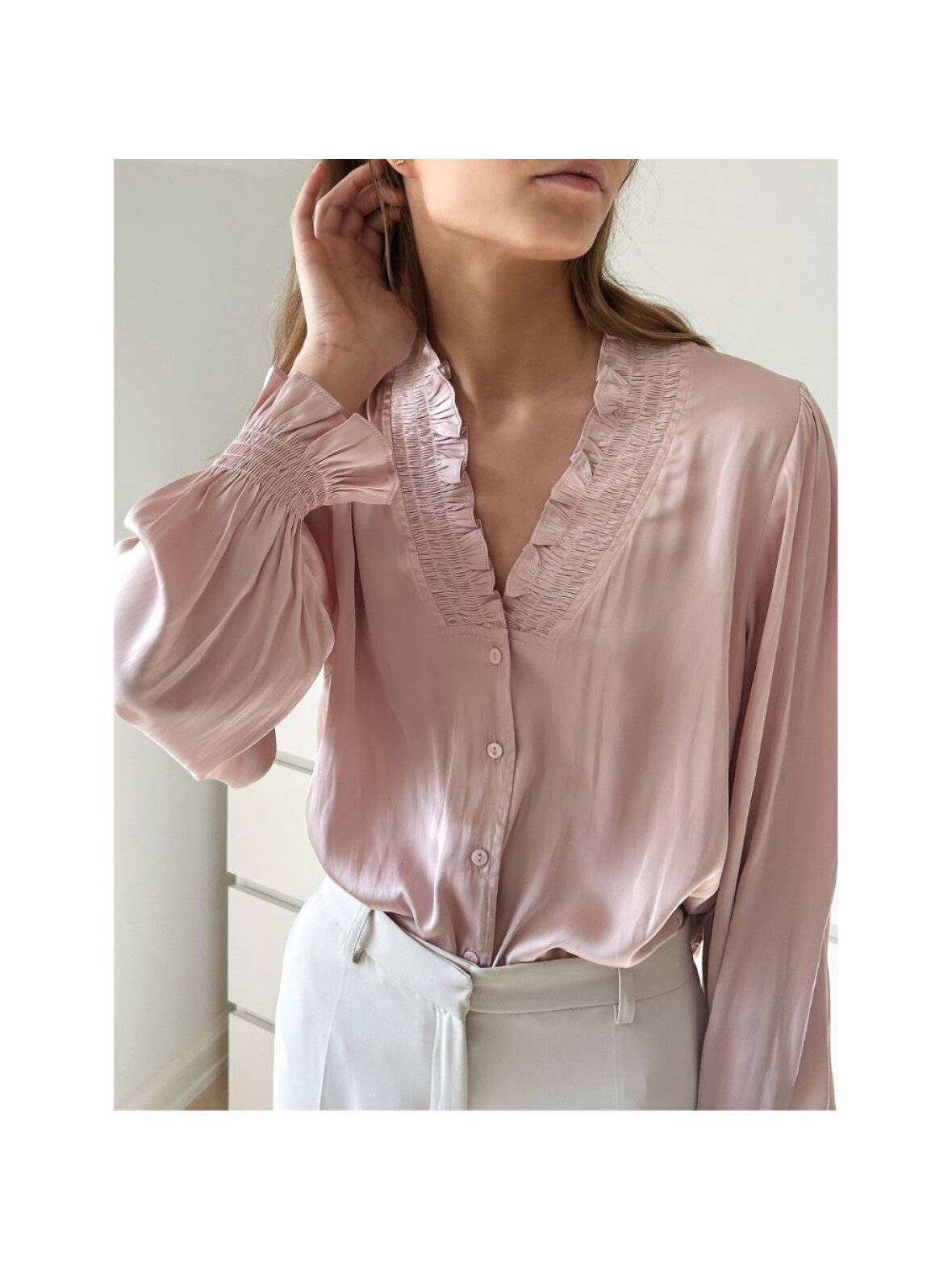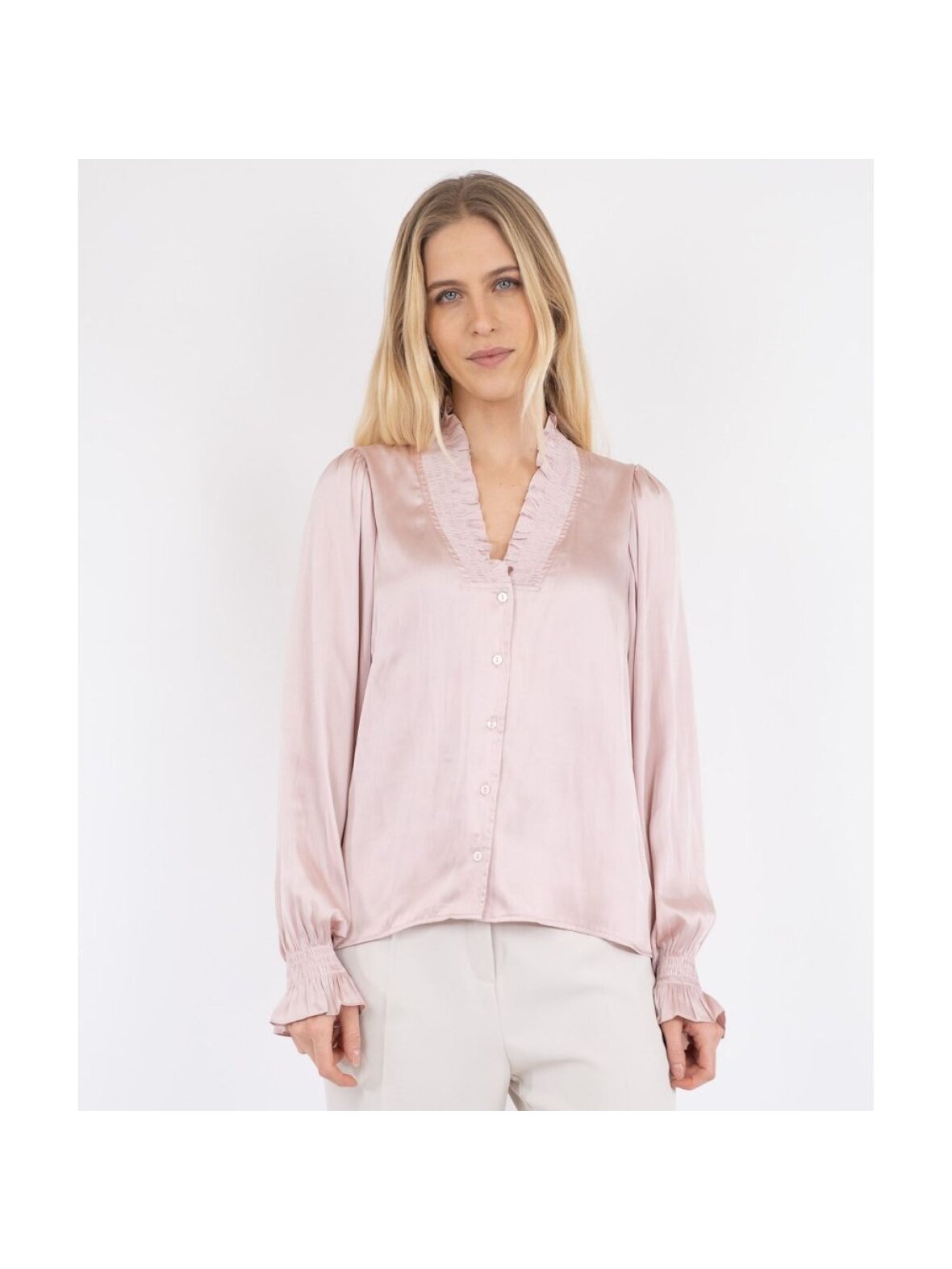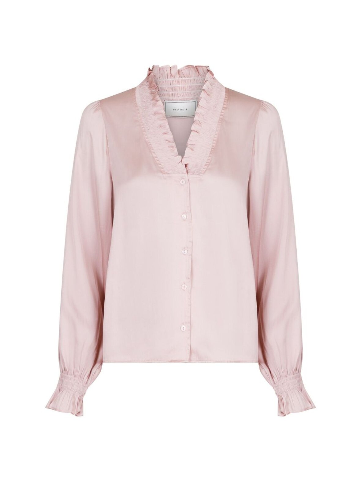 Smuk og elegant skjorte fra Neo Noir. Skjorten er designet med flæser ved brystet, v-udskæring og lidt posede ærmer og stof der falder smukt. Perfekt til et par lyser hørbukser til sommer.