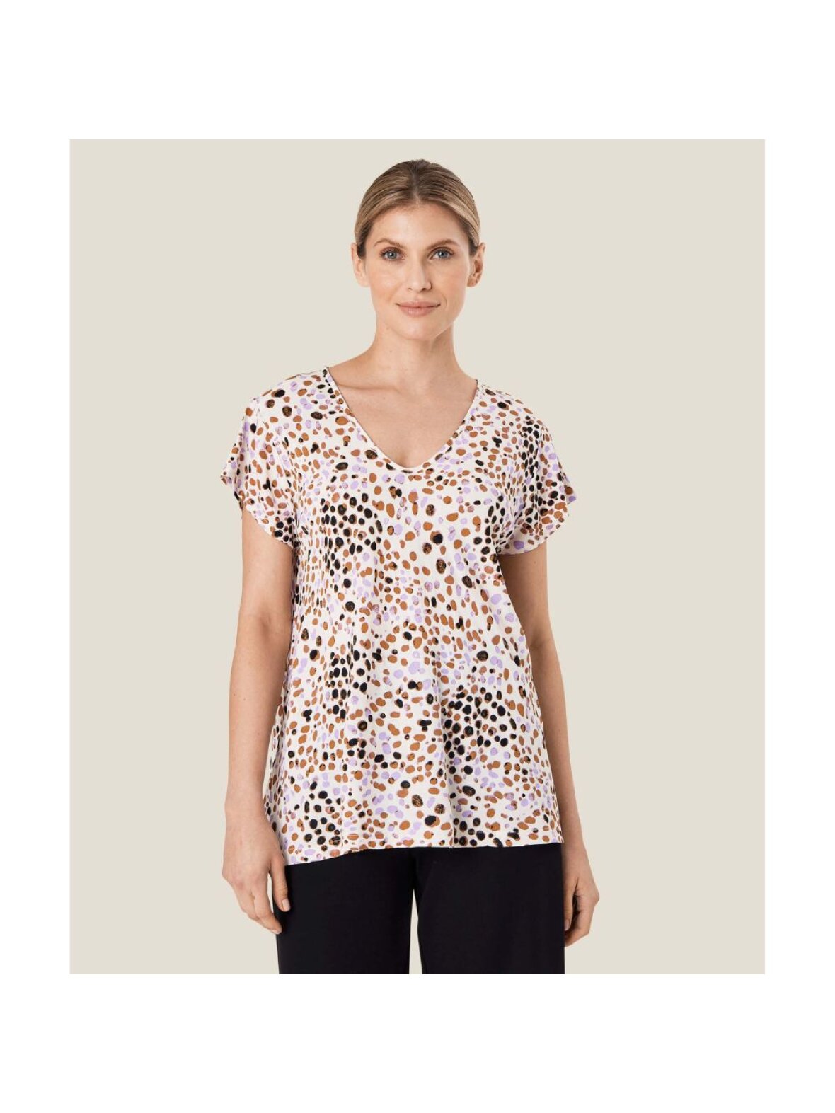 Smuk top fra Masai. Er designet med korte ærmer, "bias snit" så den går ind til kroppen samt v-udskærring. En perfekt og behagelig top til hverdag.