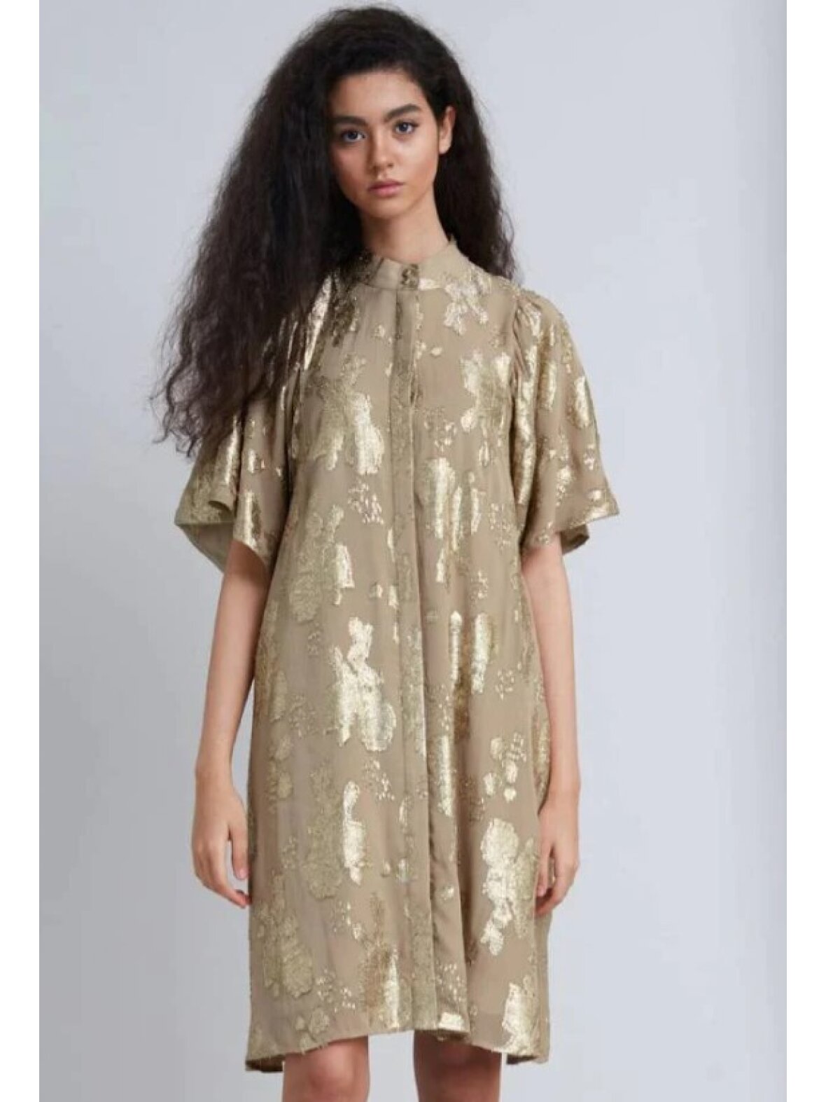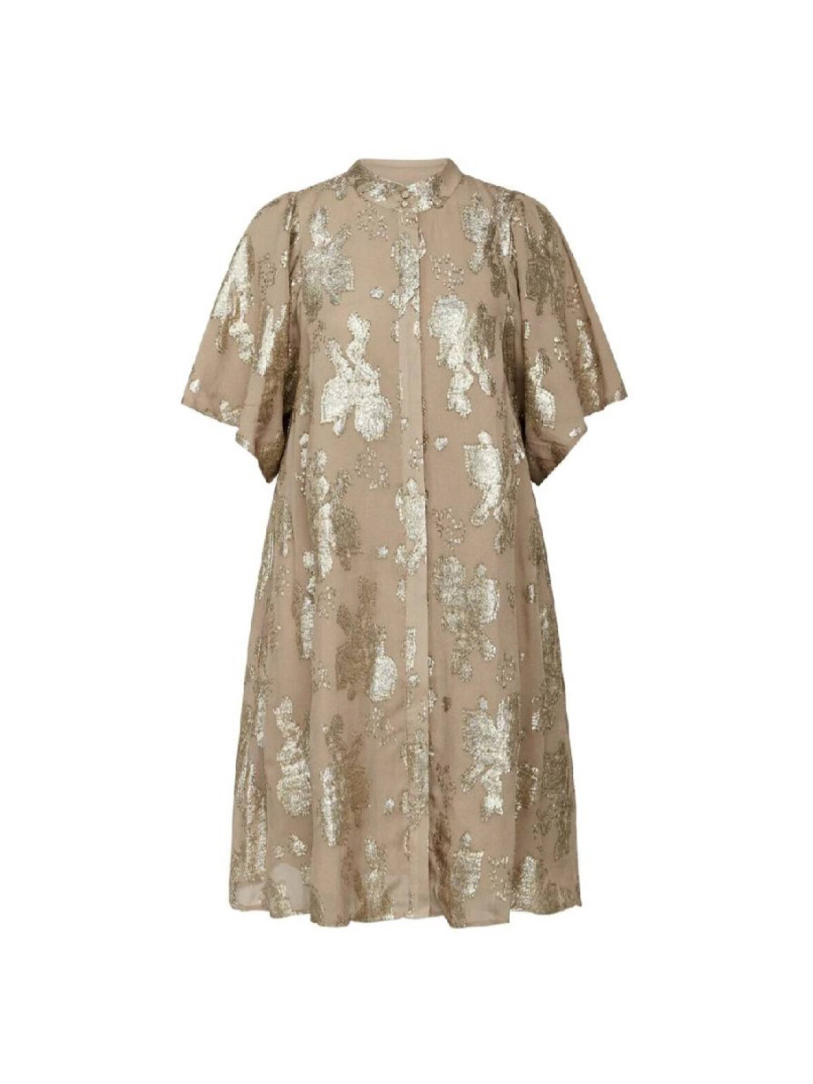 Fin oge elegant kjole fra Bruuns Bazaar. Kjolen er med kinakrave og løse korte ærmer. Er gennemknappet og kan også bruges åben. Lidt stor i størrelsen