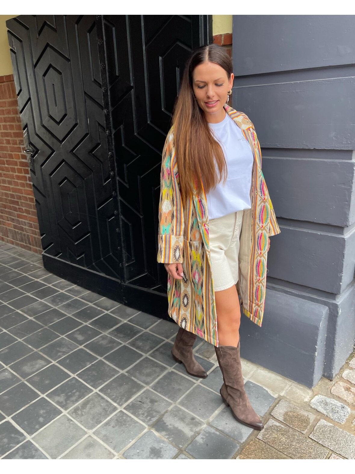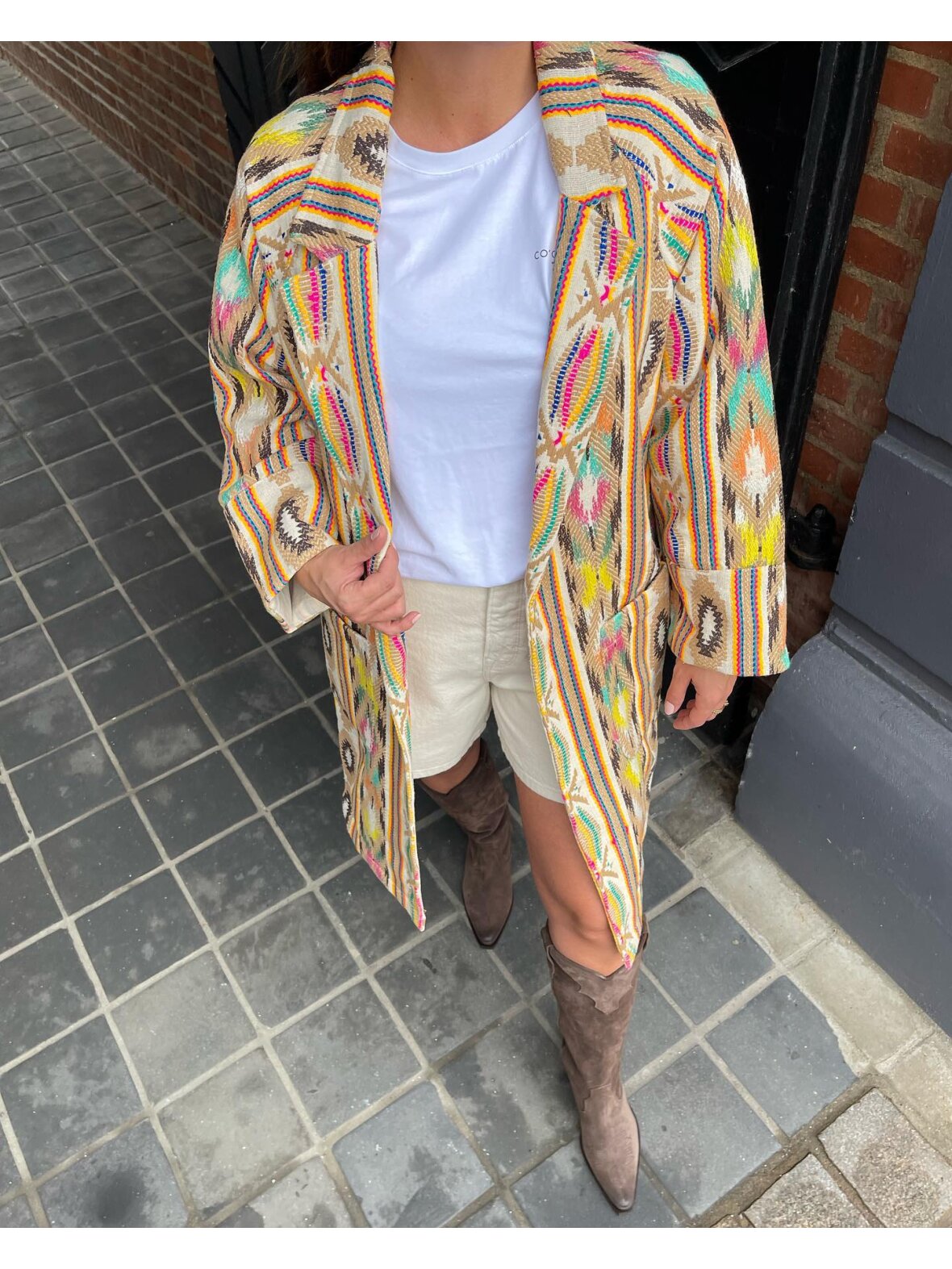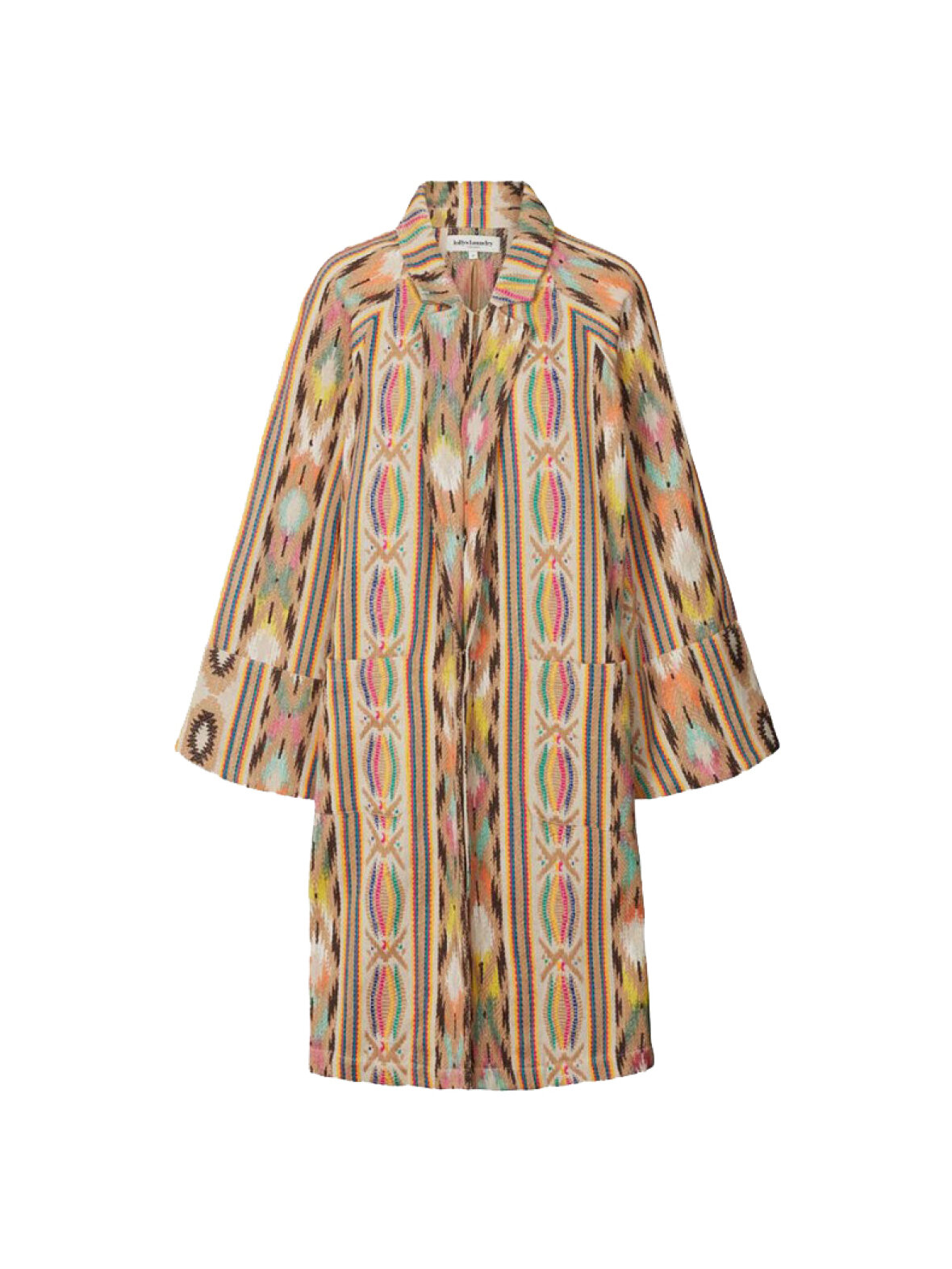 Så lækker lang jakke fra Lollys Laundry. Jakken er med lange ærmer, klassisk revers og to store frontlommer.Jakken er i flot kraftig kvalitet med flotte farver og mønstre.