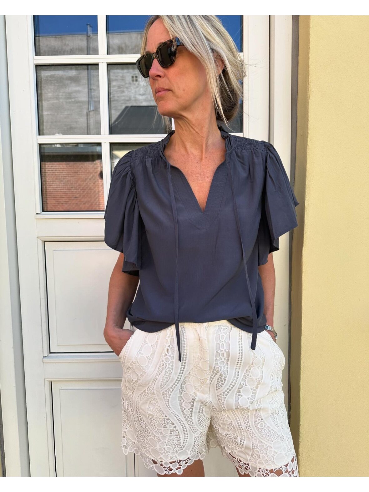 Fin klassisk top fyldt med detaljer fra Co' Couture. Toppen er designet med bindebånd foran, flæseærmer, smock over skuldrene og flæsekrave. Perfekt sammen med et par jeans, nederdel eller et par shorts.