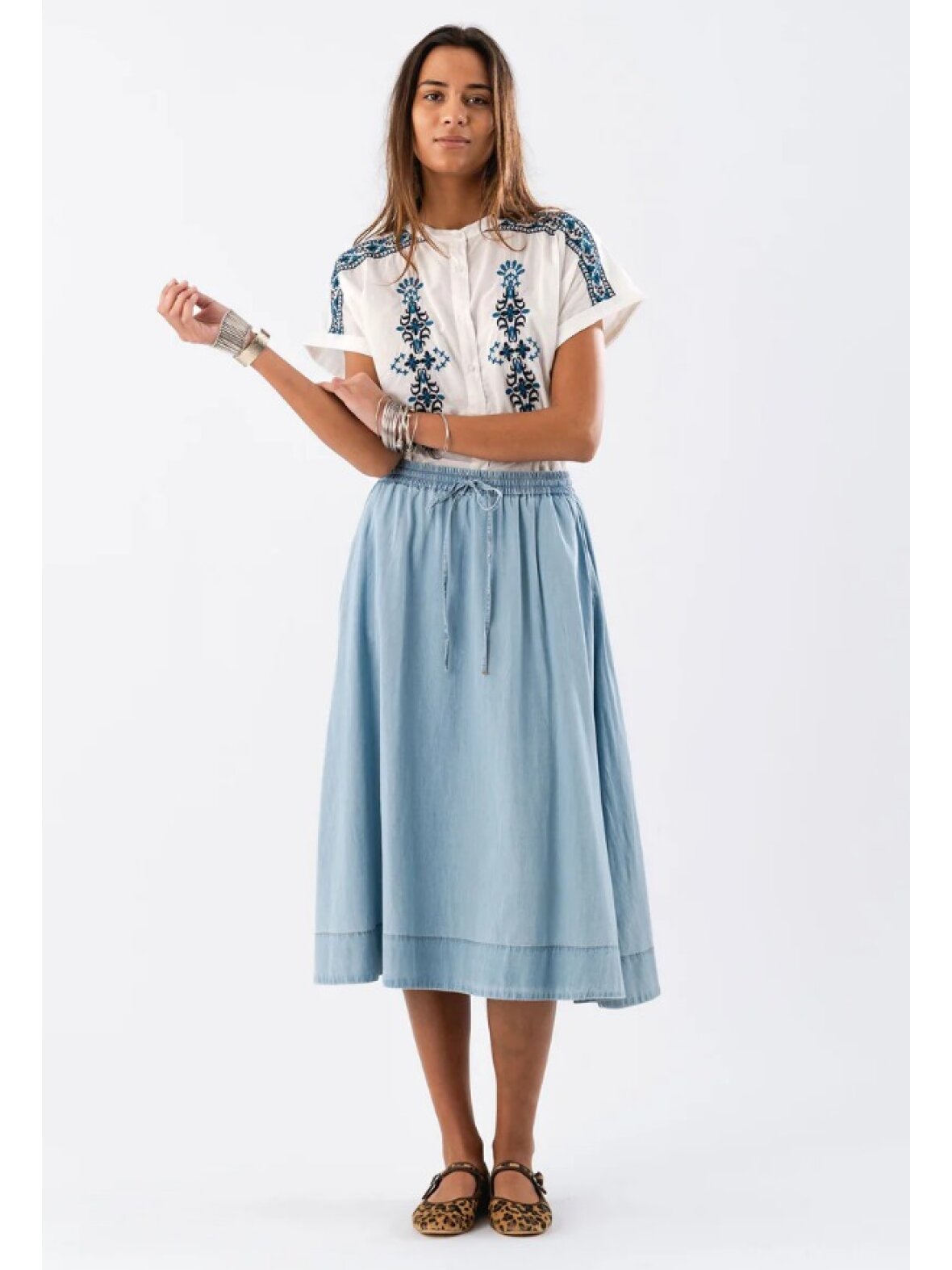 Flot nederdel fra Lollys Laundry. Nederdelen har en flatterende A-form med en bred kant forneden, og den kommer i en blød denim. Den har praktiske sidelommer, og den har elastik og snørebånd i taljen, der giver dig mulighed for at tilpasse pasformen. Den er midi længde og har meget vidde, der giver den et lidt klassisk look blandet med retro charme.