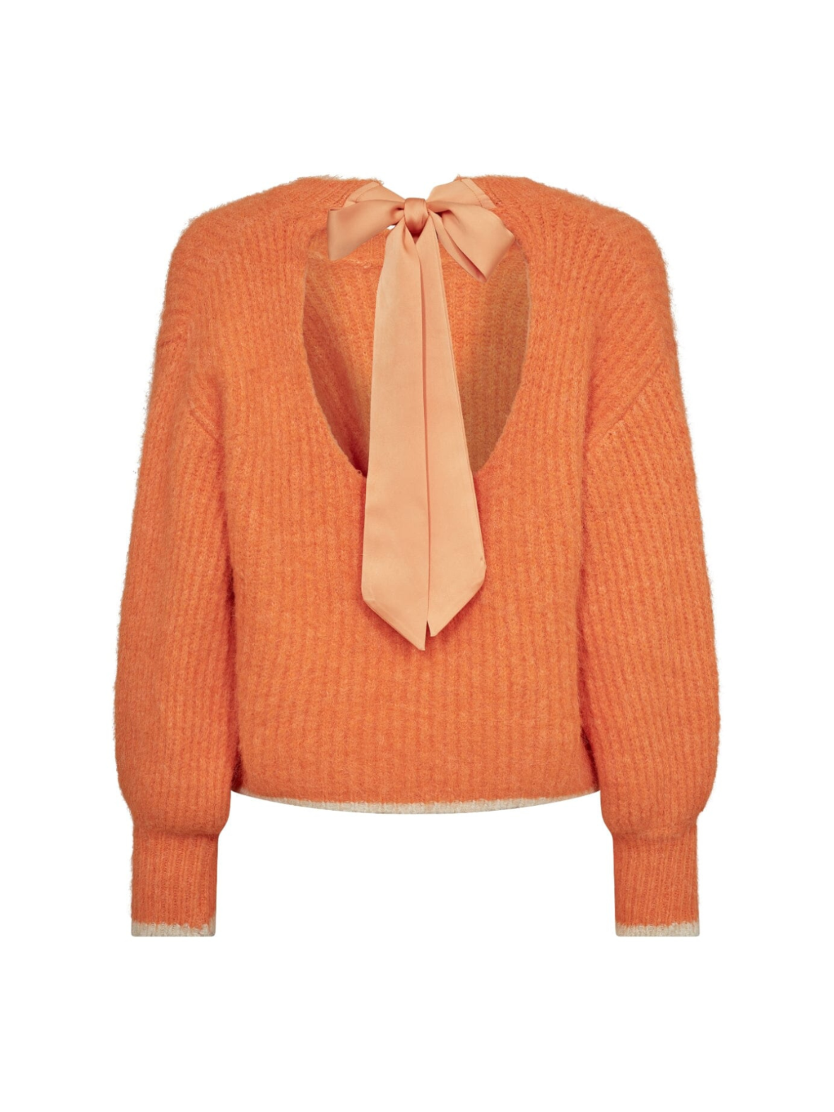 Lækker striktrøje fra Co' Couture i en flot orange farve. Strikken er designet med korte pufærmer, bindebånd i nakken og åben ryg. Derudover er der fine detaljer i nederst også på ærmerne med en lysere kant.