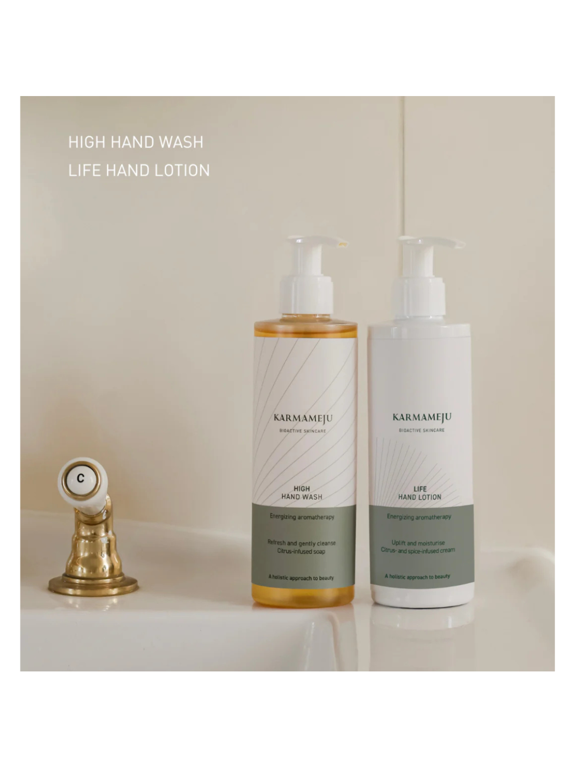 LIFE HANDLOTION: En nærende og fugtgivende håndcreme, der hurtigt absorberes af huden og efterlader hænderne bløde og velplejede. Formuleret med en base af økologisk sheasmør, arganolie og havtornolie, kombineret med en naturlig og opfriskende duft af citron, sort peber og citrongræs for en opløftende sanseoplevelse.