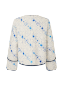 Smuk jakke fra Lollys Laundry i en smuk cremefarve. Jakken er udsmykket med et smukt, geometrisk mønster i blå nuancer, der tilfører et unikt og kunstnerisk præg. De klassiske quiltede detaljer kombineret med kontrastkanter i mørkeblå giver jakken et raffineret og stilrent look, der passer til både hverdagsbrug og særlige lejligheder. Med praktiske forlommer og en behagelig, afslappet pasform er denne jakke lige dele funktionel og fashionable.