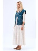 Flot og moderne denim vest fra Lollys Laundry. Vesten er et moderne take på en klassisk denimvest. Den er fremstillet i en slidstærk mørk denim med en flot vintage-wash, og den har et unikt design med en asymmetrisk udskæring og store, funktionelle lommer, der tilfører et råt udtryk og masser af attitude. Den har cool detaljer som skulderstropper, læg og metalknaplukninger og den afsluttes med en markant, V-formet kant bagpå, som giver vesten en spændende silhuet.