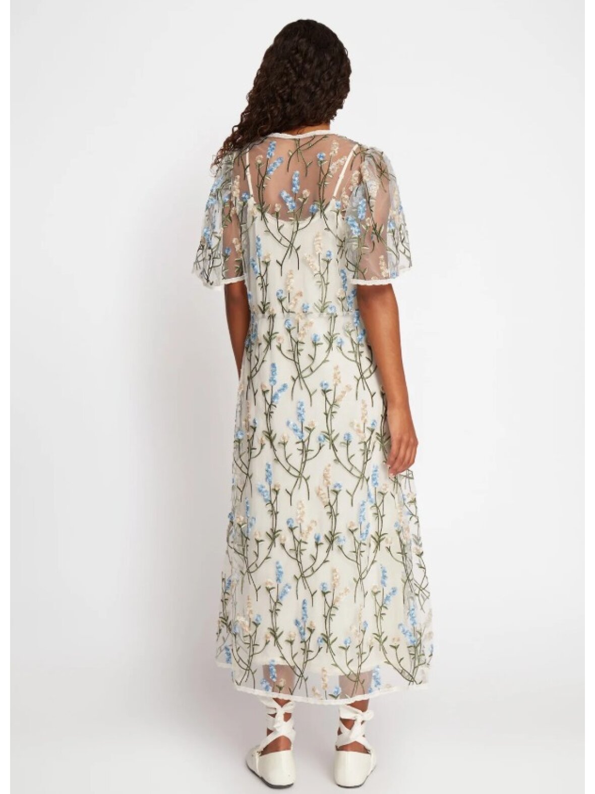 Utrolig smuk kjole med en elegant blanding af pailletter og broderier fra Munthe. Kjolen har et smukt blomstermønster. Kjolen er designet til at være gennemsigtig, med en elegant underkjole under. Underkjolen kan tages af for at give flere styling muligheder. Kjolen har en rund halsudskæring og løse ærmer. Modellen er 173 cm og er iført størrelse 36.