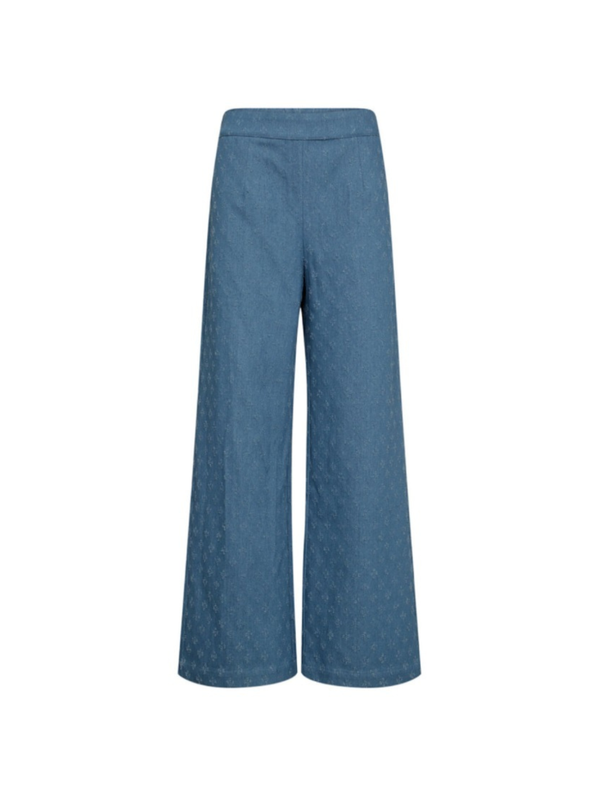 Flotte og behagelig denim bukser fra Co'couture. Bukserne er med flot råt mønster, vidde i benene, en højtalje og elastik i livet og lukkes i siden med en skjult lynlås. Bukserne har fine læg og sidelommer