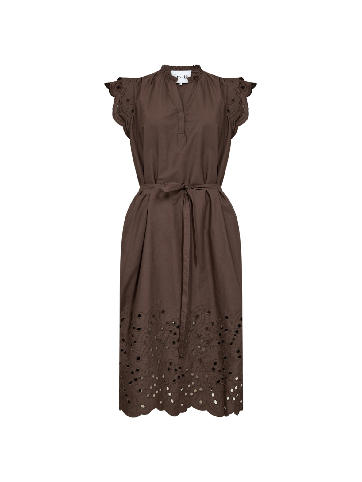 Fin kjole med broderi anglaise i en lækker bomulds kvalitet fra Leveté Room. Kjolen har aftageligt bindebånd i taljen og stiklommer i siderne. Kjolen har flæse i kraven og v-hals som fortsætter ned i en skjult knapåbning.