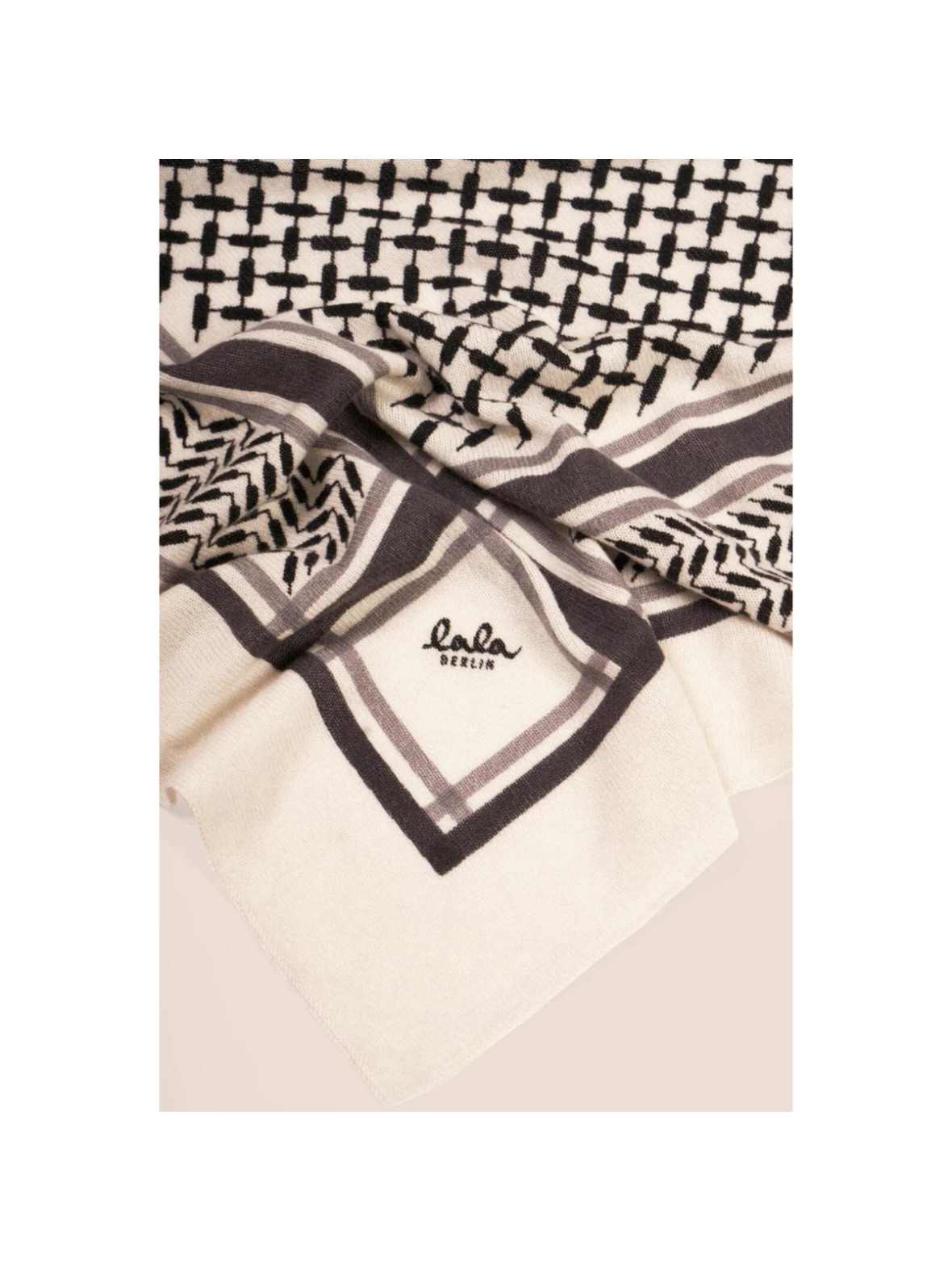 Dette klassiske trekantede tørklæde fra Lala Berlin kombinerer et tidløst mønster med et elegant farvespil i sort og offwhite. Det bløde materiale falder smukt og gør tørklædet ideelt til både hverdag og mere sofistikerede looks.
