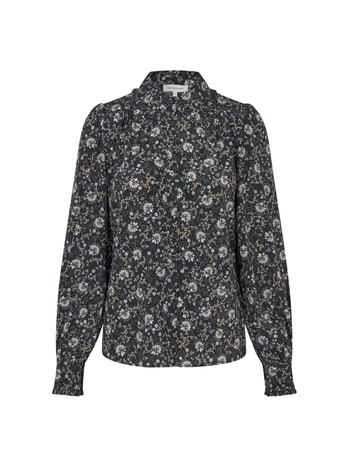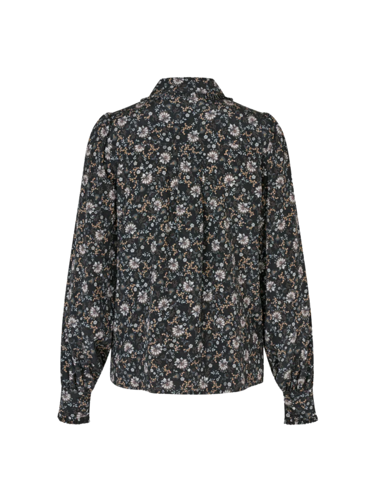 Elegant skjorte i mørk bund med et smukt, detaljeret blomsterprint. De fine rynkedetaljer ved skuldre og krave tilfører et feminint og sofistikeret udtryk. Designet med klassisk knaplukning og lange ærmer med manchetter, der giver et tidløst look. Perfekt til både hverdagsbrug og mere elegante anledninger.