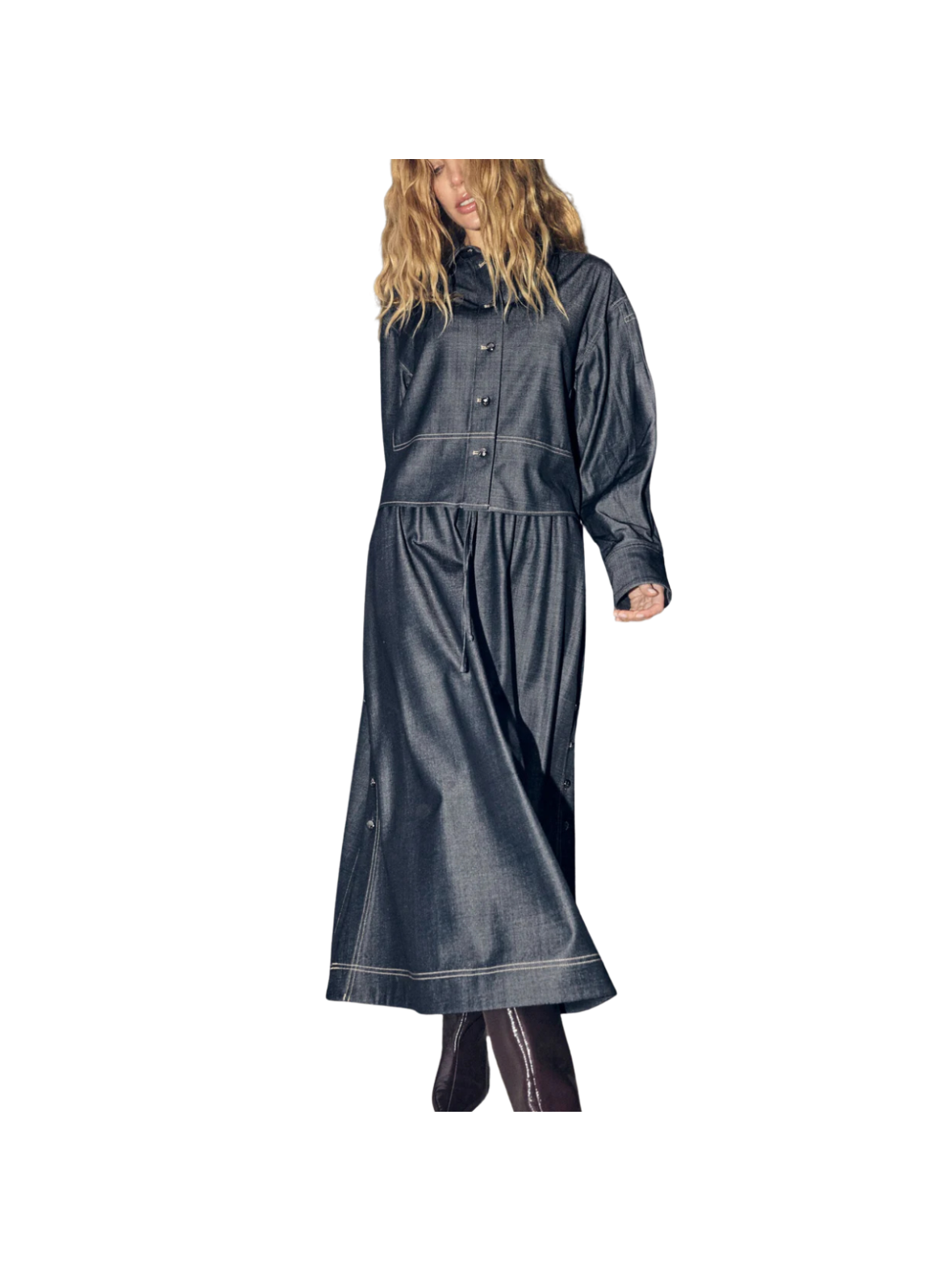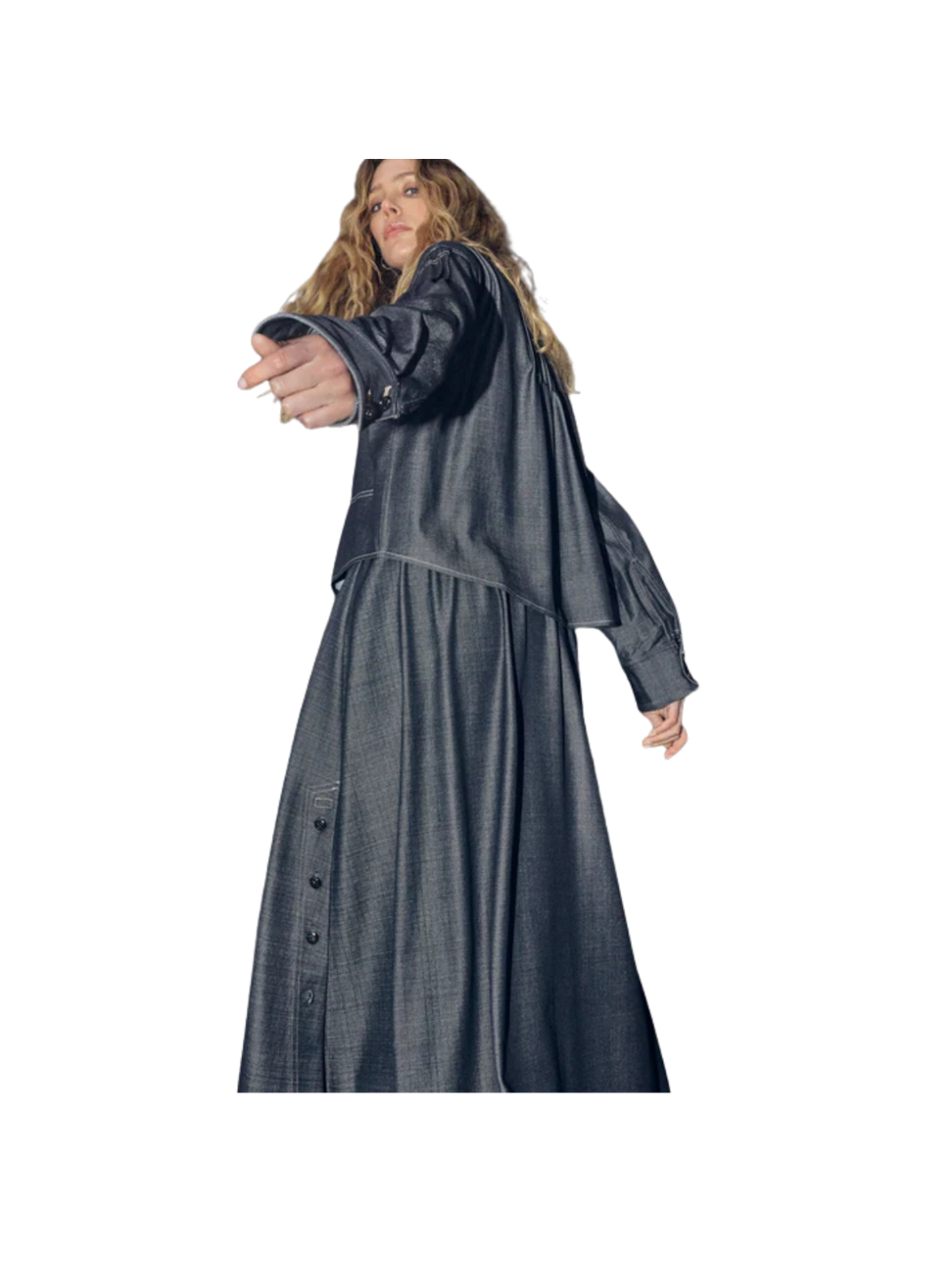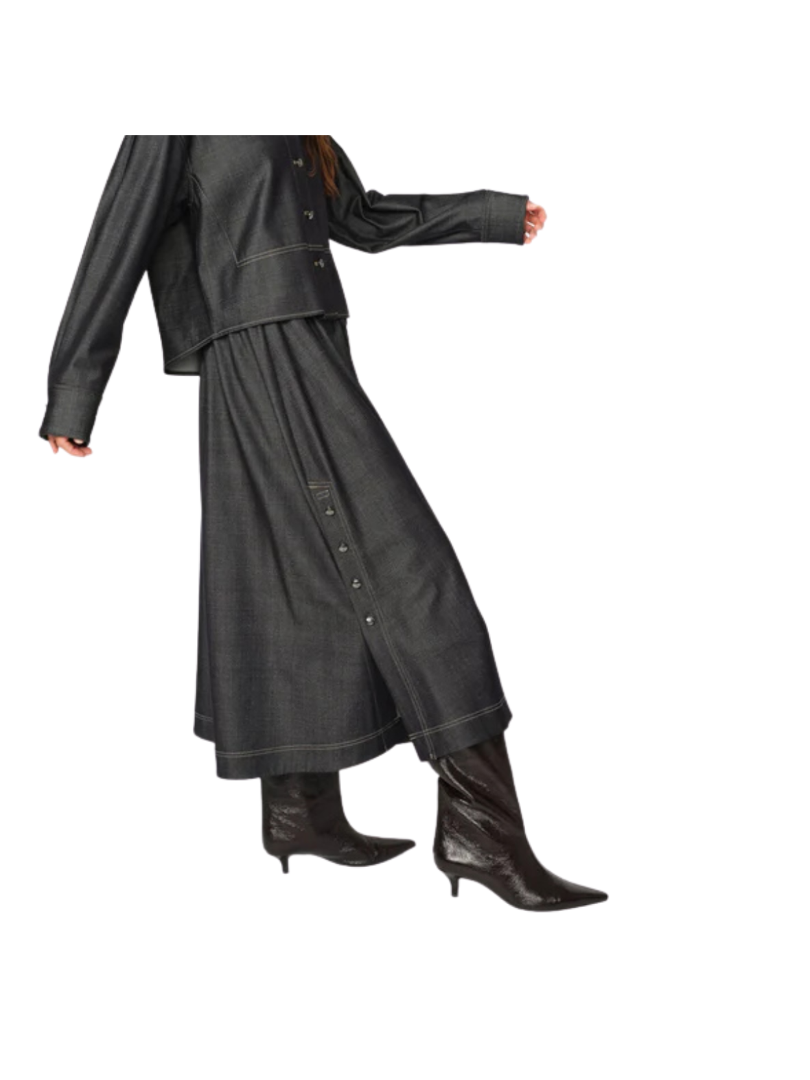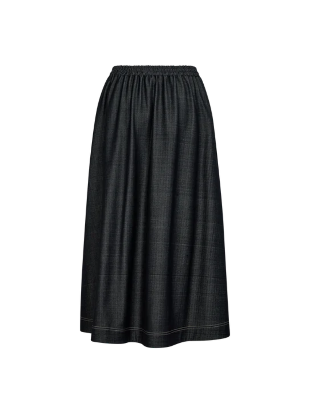 En klassisk nederdel med et moderne twist, der kombinerer komfort og elegance. Det elastiske taljebånd giver en afslappet pasform, mens det lette fald skaber en feminin silhuet. Den sorte farve gør den uundværlig i garderoben, da den kan styles både afslappet med en strik eller chic med en silkebluse. Perfekt til hverdagsbrug og mere polerede anledninger.