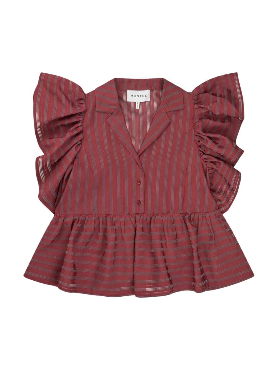 Denne feminine bluse kombinerer klassiske striber med moderne detaljer. Den har en flatterende peplum-silhuet, som giver et let og luftigt fald, samt voluminøse korte ærmer, der skaber et elegant statement.