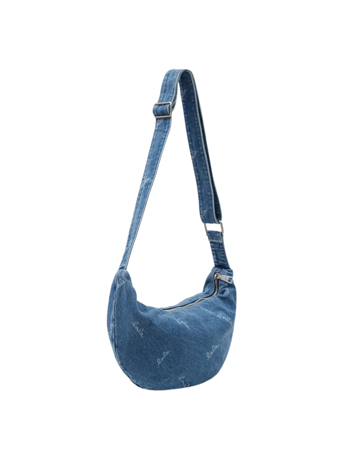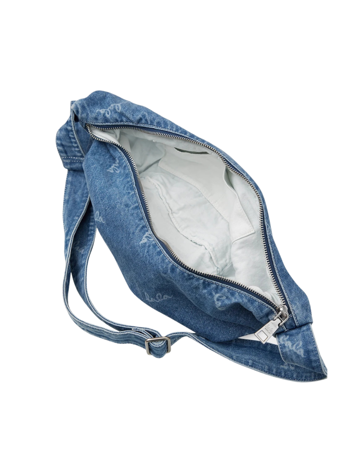 Super cool denim Crossbody Bag fra Lala Berlin. Tasken er designet i en cool, buet silhuet og fremstillet i vaskbar denim med all-over tone-i-tone logoprint for et moderne og urbant udtryk. Den justerbare skulderrem gør det nemt at bære tasken både crossbody og over skulderen, mens det rummelige hovedrum med lynlås holder dine essentials sikkert på plads.