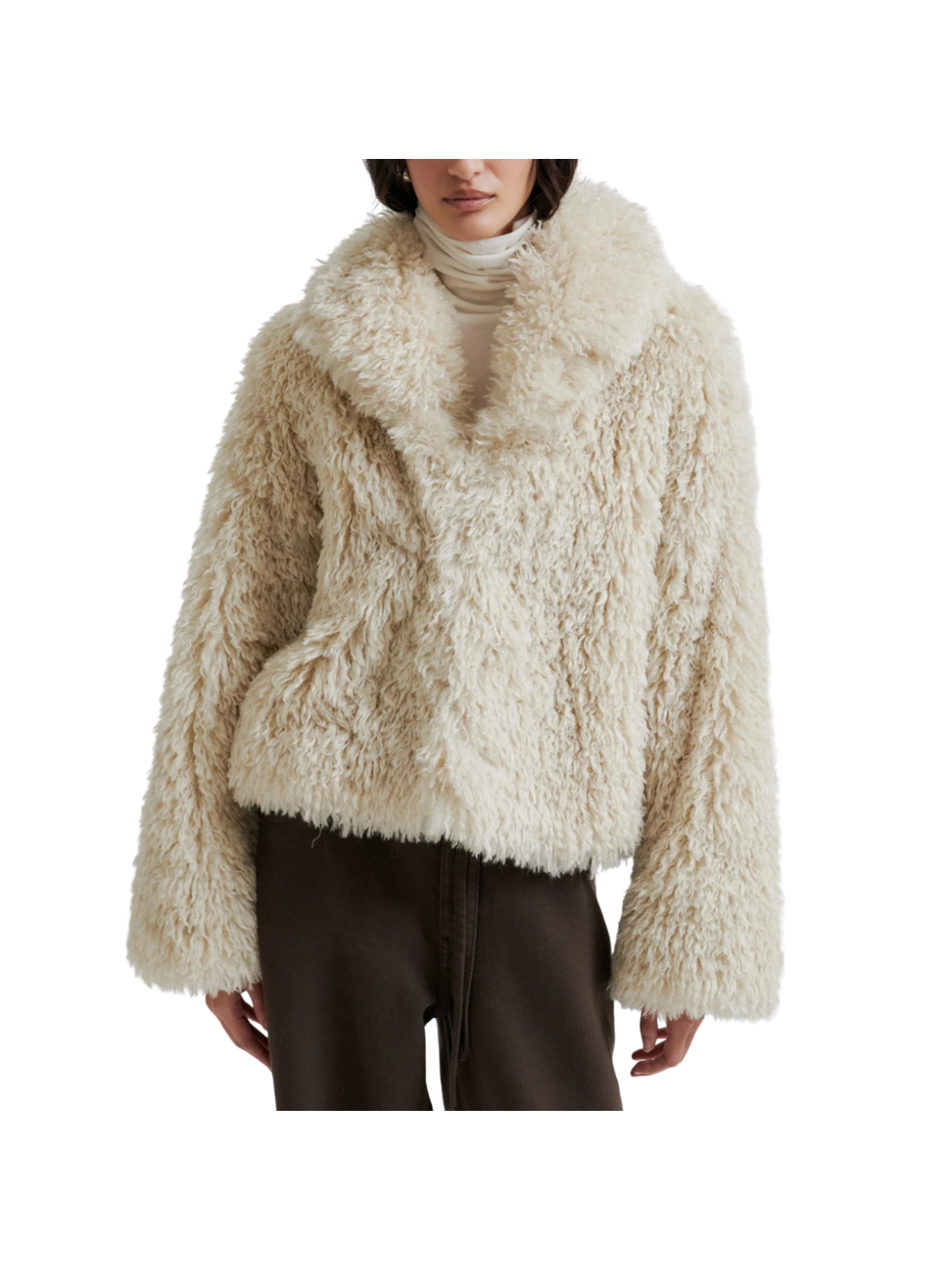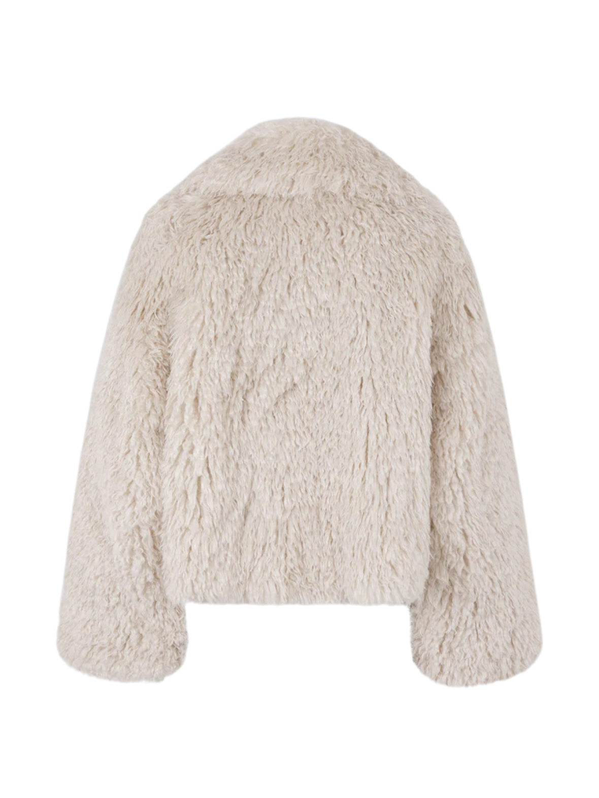 Denne fluffy jakke fra Second Female er den ultimative kombination af varme og stil. Den bløde faux fur giver et luksuriøst look, mens den løse pasform gør den nem at style over alt fra strik til kjoler. Den lyse, neutrale farve tilfører et feminint touch og gør den til en tidløs favorit i garderoben.