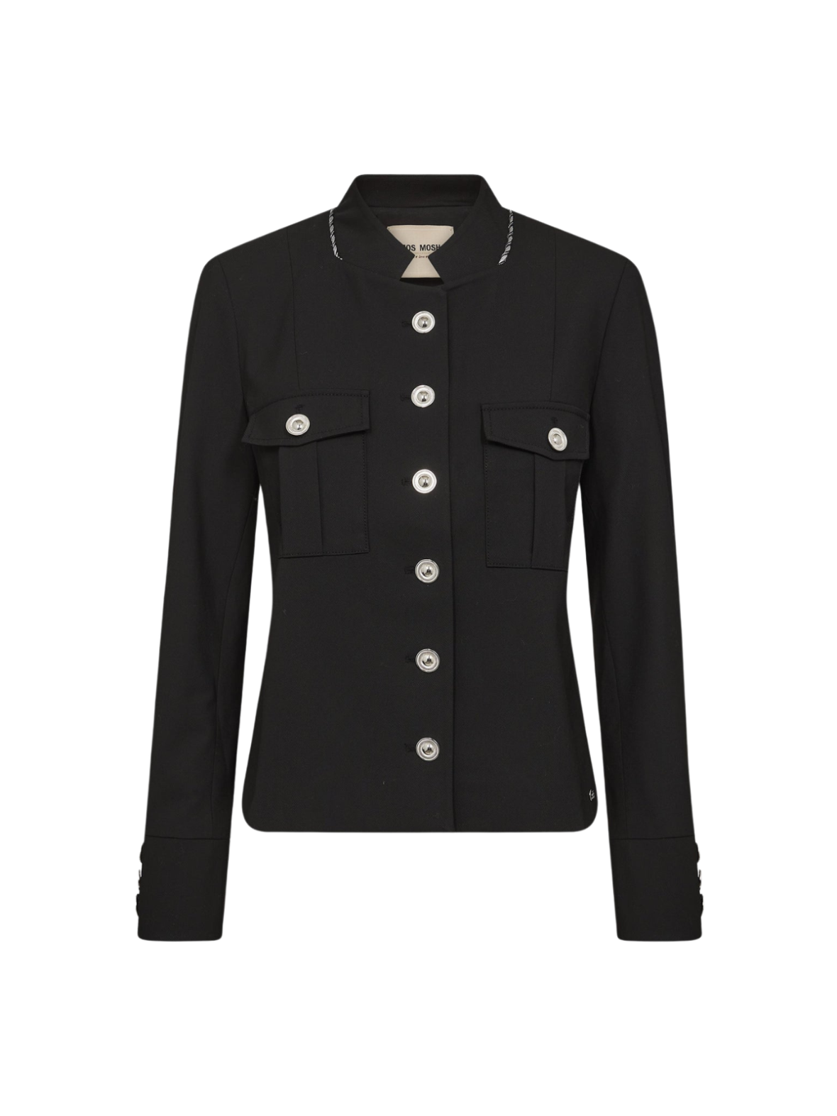 Elegant jakke i sort med et struktureret og sofistikeret udtryk. Den figursyede pasform fremhæver silhuetten, mens de markante knapper og brystlommer tilfører et stilfuldt, klassisk touch. Perfekt til både arbejde og mere formelle anledninger. En tidløs jakke, der kombinerer elegance med moderne detaljer.