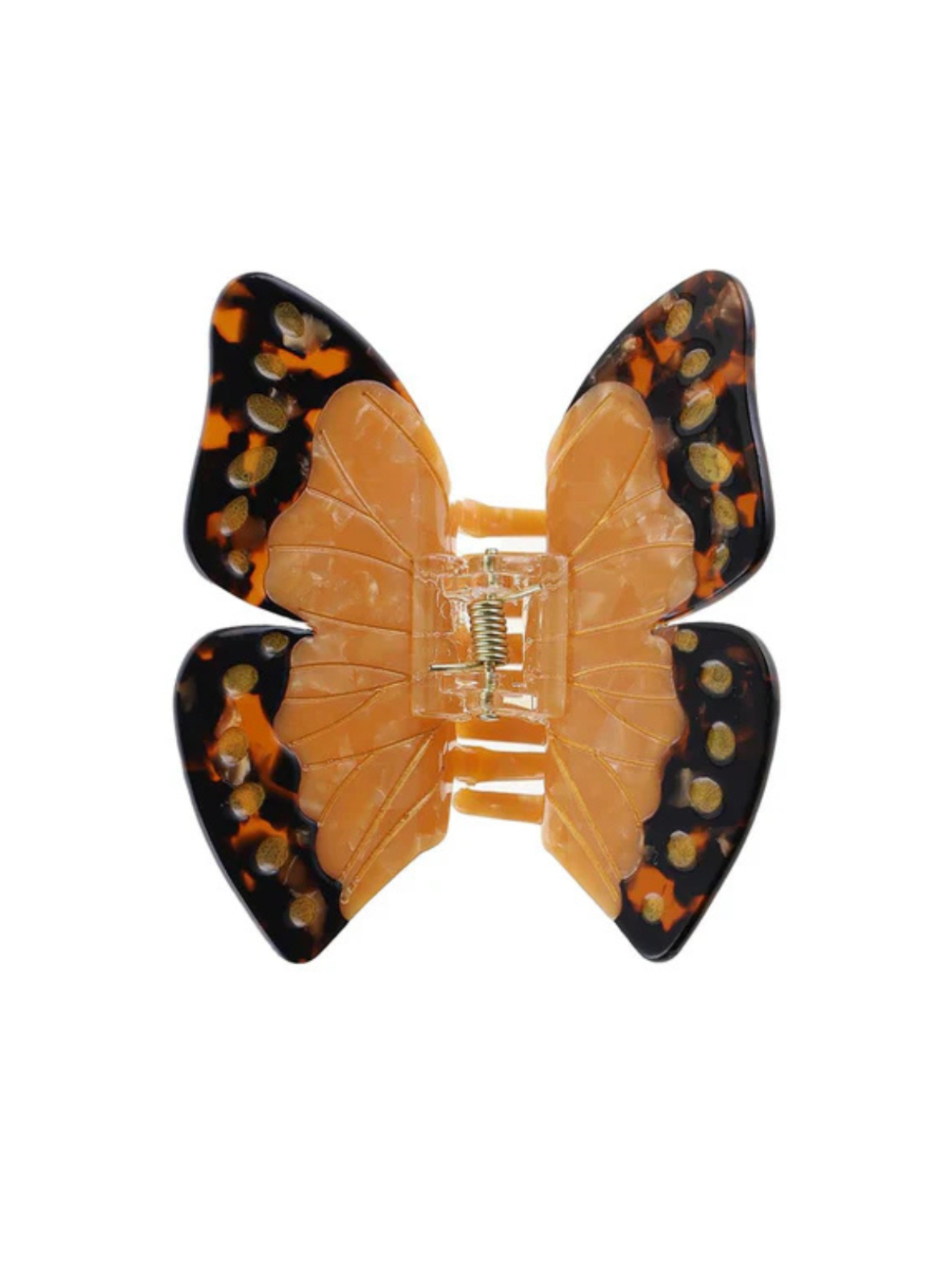 Denne hårklemme fra By Stær er formet som en sommerfugl og giver et legende og feminint udtryk til din frisure. De orange og brunlige nuancer kombineret med et mønstret skær skaber et smukt spil af farver. Brug den til at samle håret i en løs opsætning eller som blikfang i en casual hverdagsfrisure. Et charmerende accessory, der tilfører både stil og personlighed.