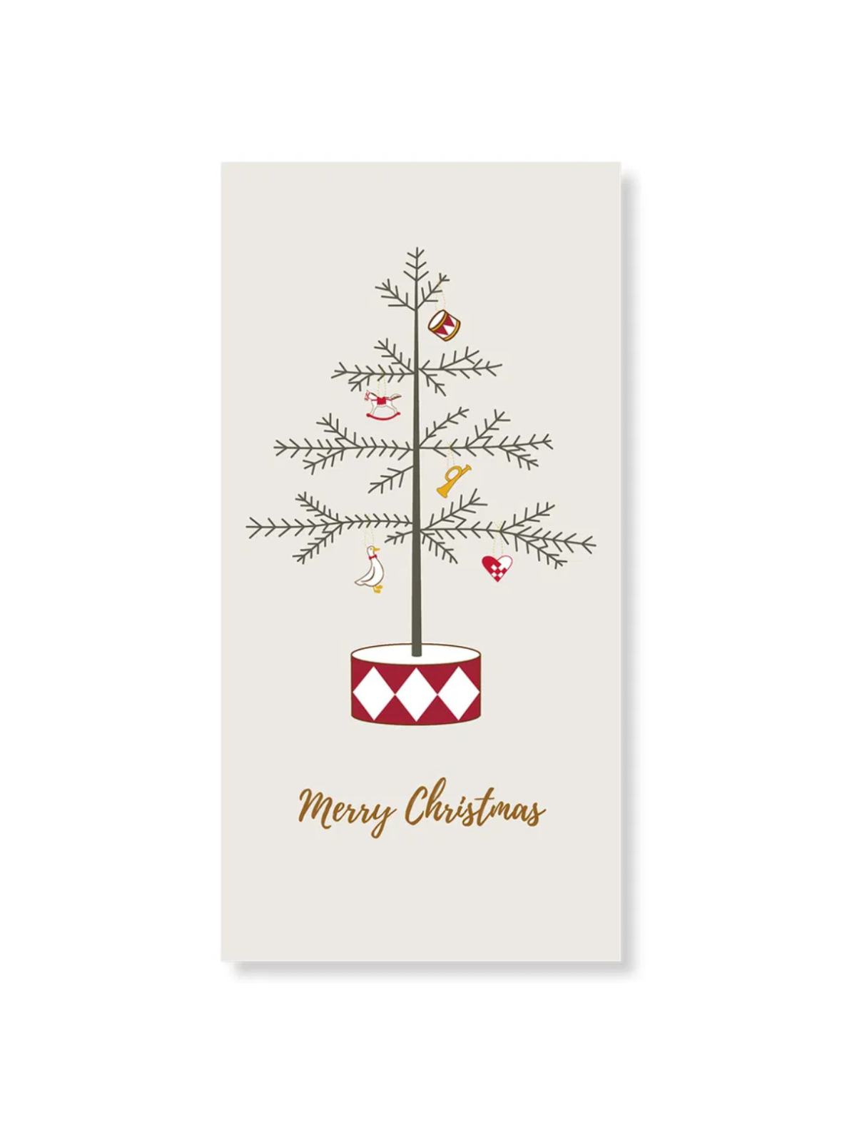 Denne papirserviet prydes af et fint juletræ i klassisk stil, pyntet med små traditionelle ornamenter og placeret på en rød trommefod. Teksten "Merry Christmas" i gyldne bogstaver giver et elegant og festligt touch.