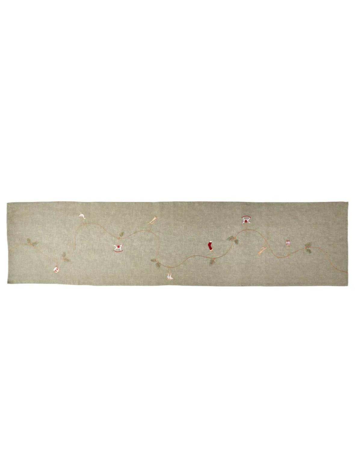Denne smukke juleløber i naturfarvet stof er dekoreret med broderede julemotiver som trommer, julesokker og små ornamenter. Det enkle og klassiske design skaber en hyggelig atmosfære ved bordet og passer perfekt til både moderne og traditionelle opdækninger.