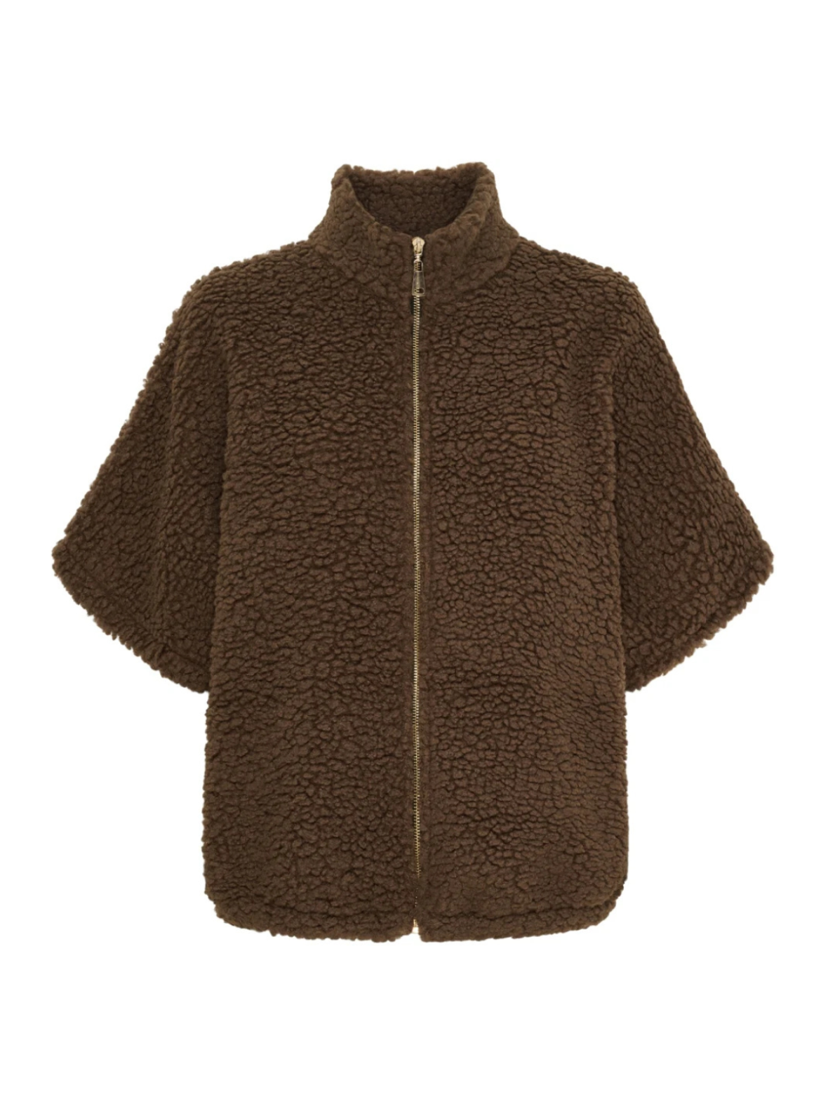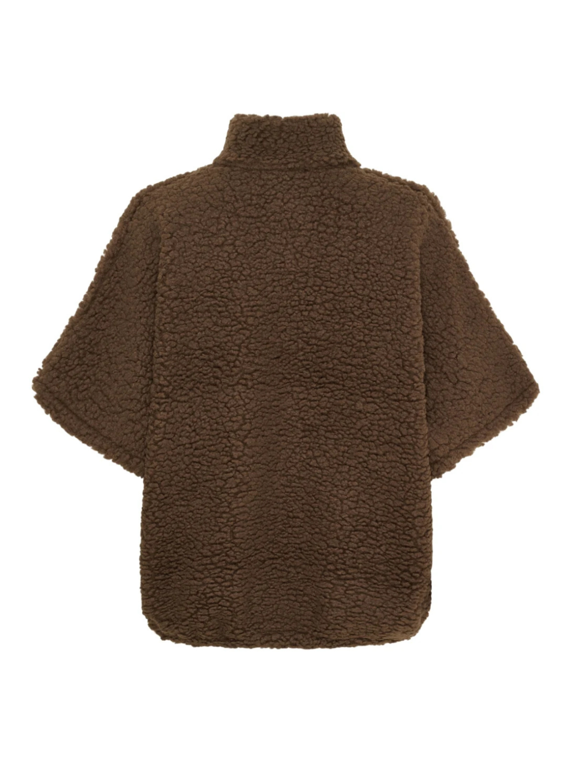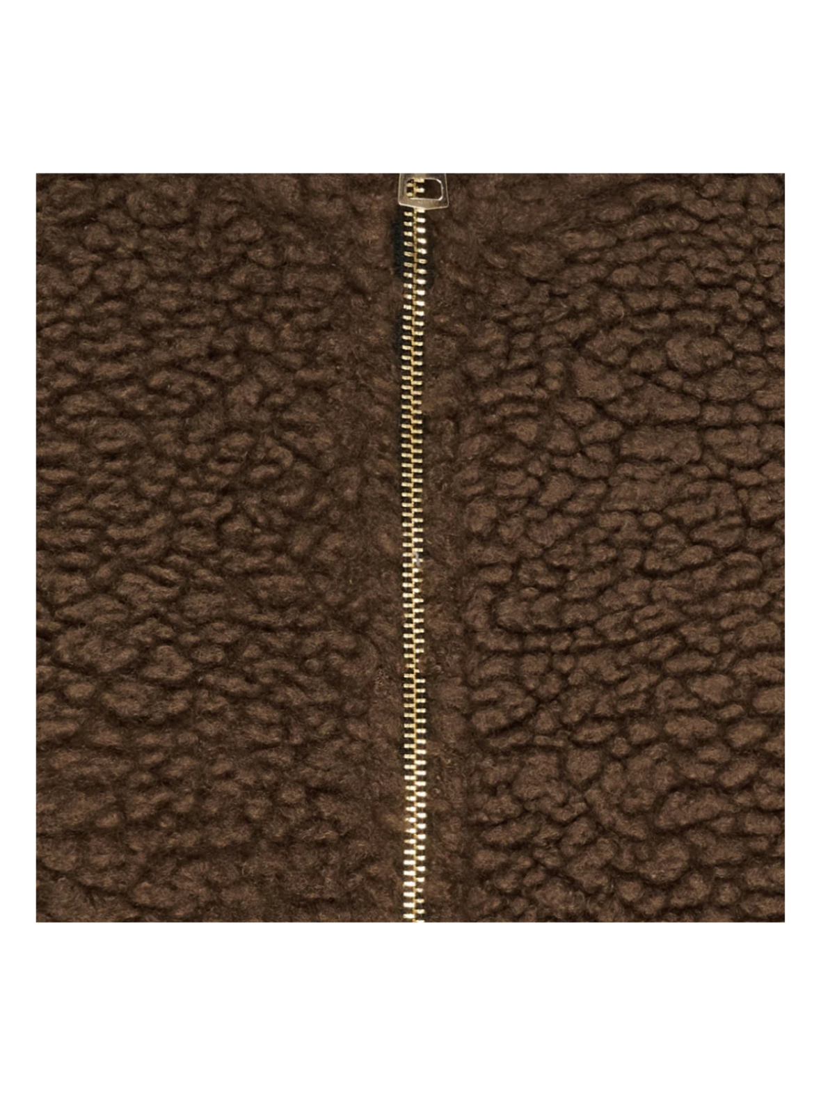 Denne vest fra Marta du Château er en blød og vamset style i brun teddy-kvalitet. Den har korte ærmer, høj hals og praktisk lynlås, som giver et afslappet men moderne udtryk. Perfekt til lag-på-lag styling over en strik eller skjorte i de kølige måneder. Et hyggeligt og trendy valg, der kombinerer komfort med stil.