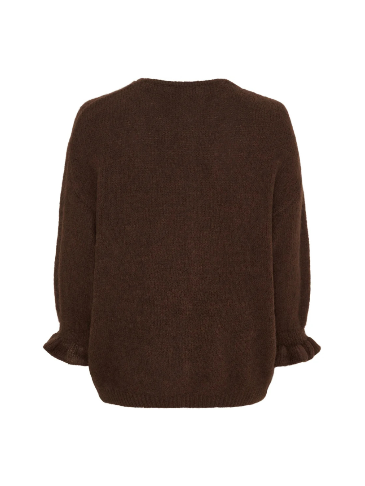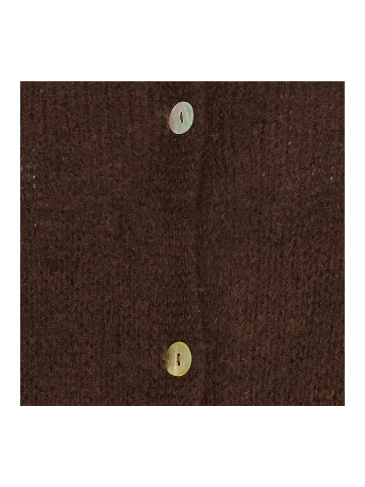 Denne cardigan fra Marta du Château er strikket i en blød kvalitet i en dyb chokoladebrun nuance. Modellen har lange ærmer med elastiske manchetter, v-hals og gennemgående knapper i forskellige nuancer, som giver et legende twist til det klassiske design. Brug den åben over en skjorte for et afslappet hverdagslook eller lukket med jeans for en enkel og hyggelig stil. En alsidig strik, der passer til både hverdag og fritid.