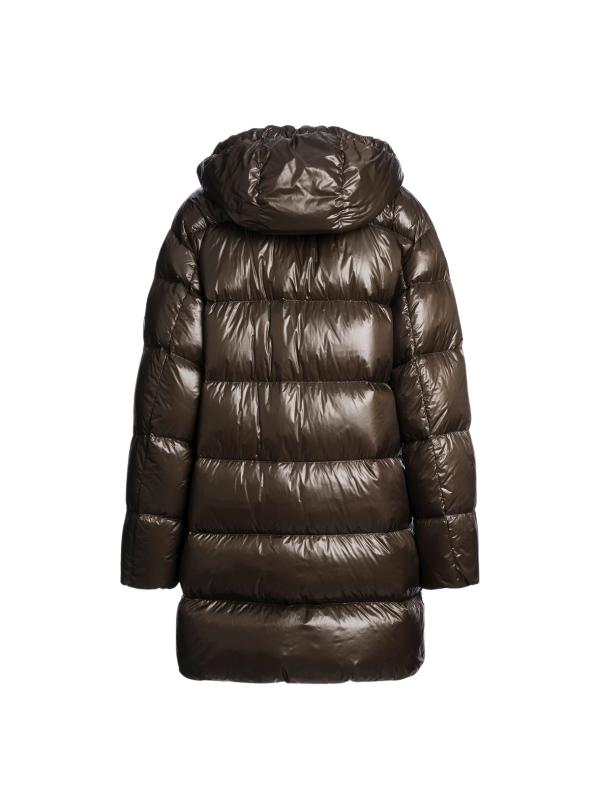 Denne lange dunjakke i blank mørkebrun finish forener komfort og stil på elegant vis. Den fyldige polstring og rummelige hætte giver optimal varme, mens den blanke overflade tilføjer et moderne touch. Med lynlåslommer og et klassisk snit er den både praktisk og sofistikeret.