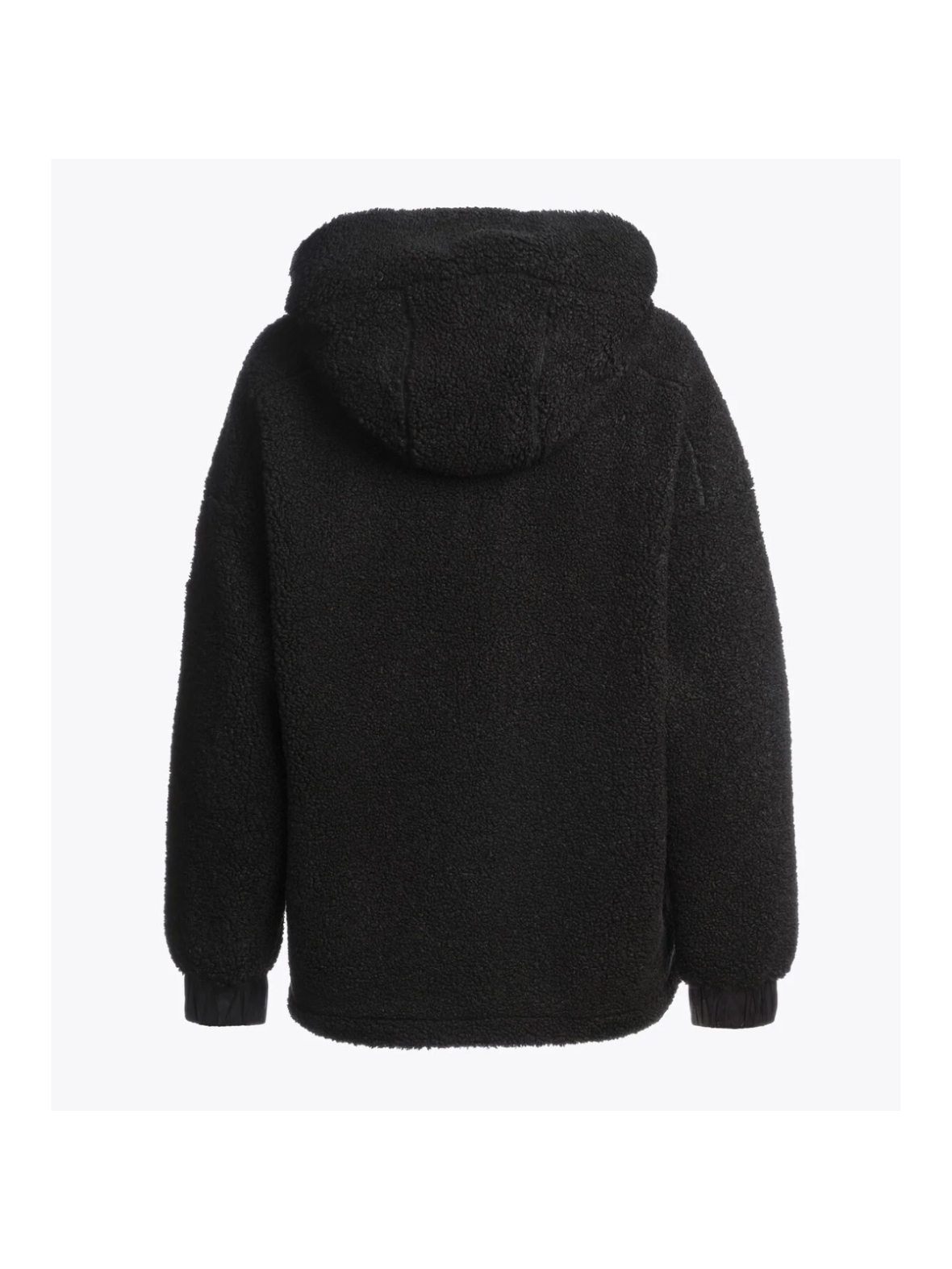 Denne sorte teddyjakke kombinerer blød komfort med sporty stil. Det varme, fleece-lignende materiale og den store hætte gør den perfekt til kolde dage. De fine detaljer som lynlåslommer og ribkanter giver et moderne og funktionelt udtryk.