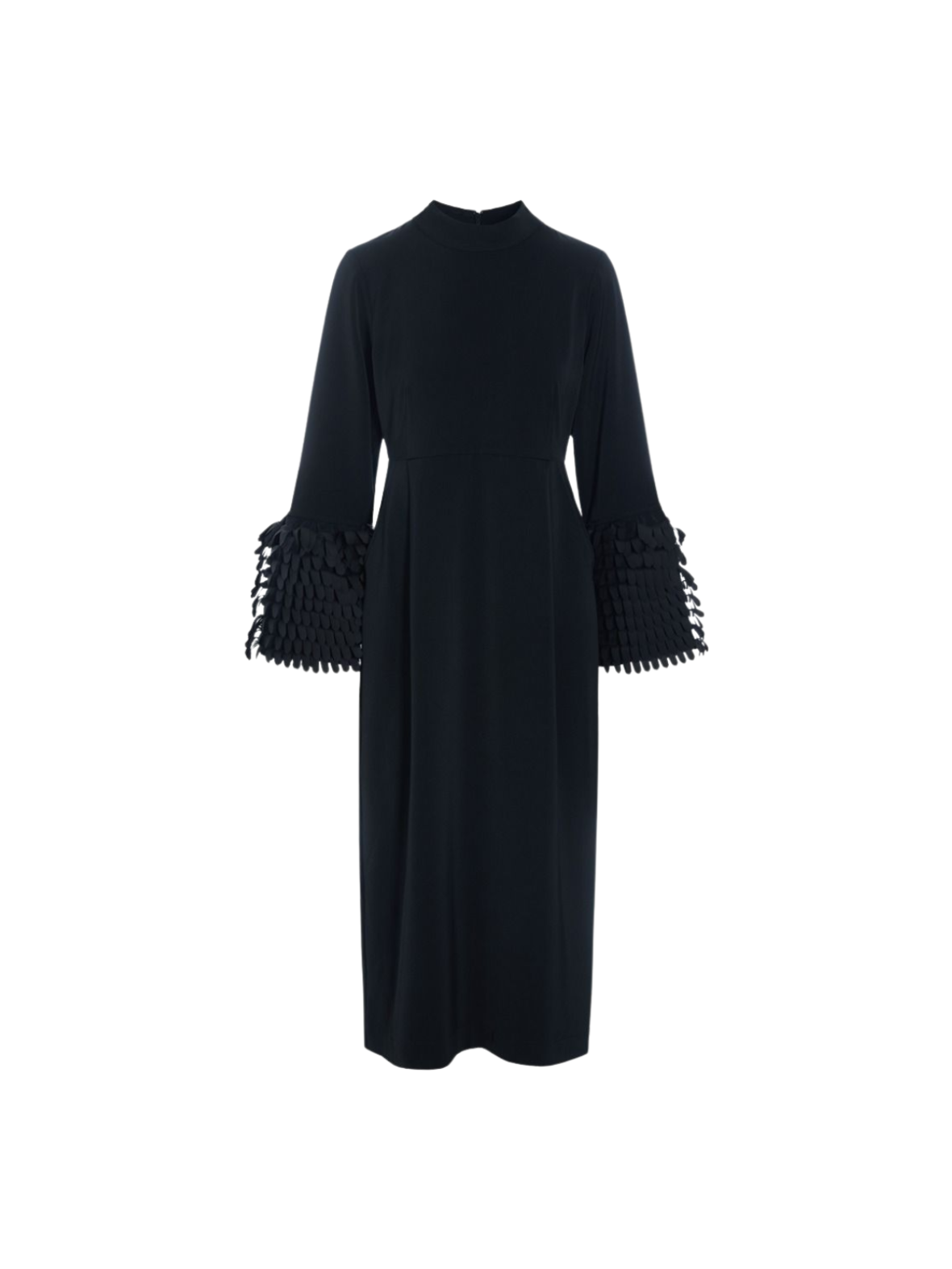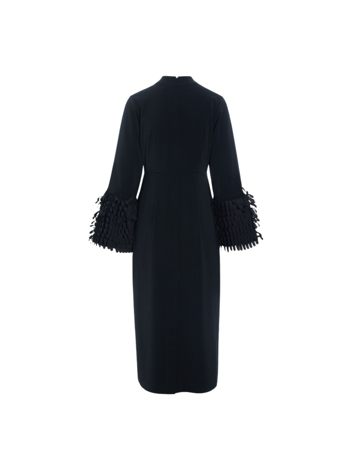 Elegant kjole i sort med et sofistikeret og moderne udtryk. Designet med høj hals og lange ærmer, hvor de dekorative detaljer ved manchetterne tilfører et unikt og eksklusivt touch. Den enkle silhuet fremhæver en feminin og stilren form. Perfekt til festlige anledninger eller elegante hverdagslooks.
