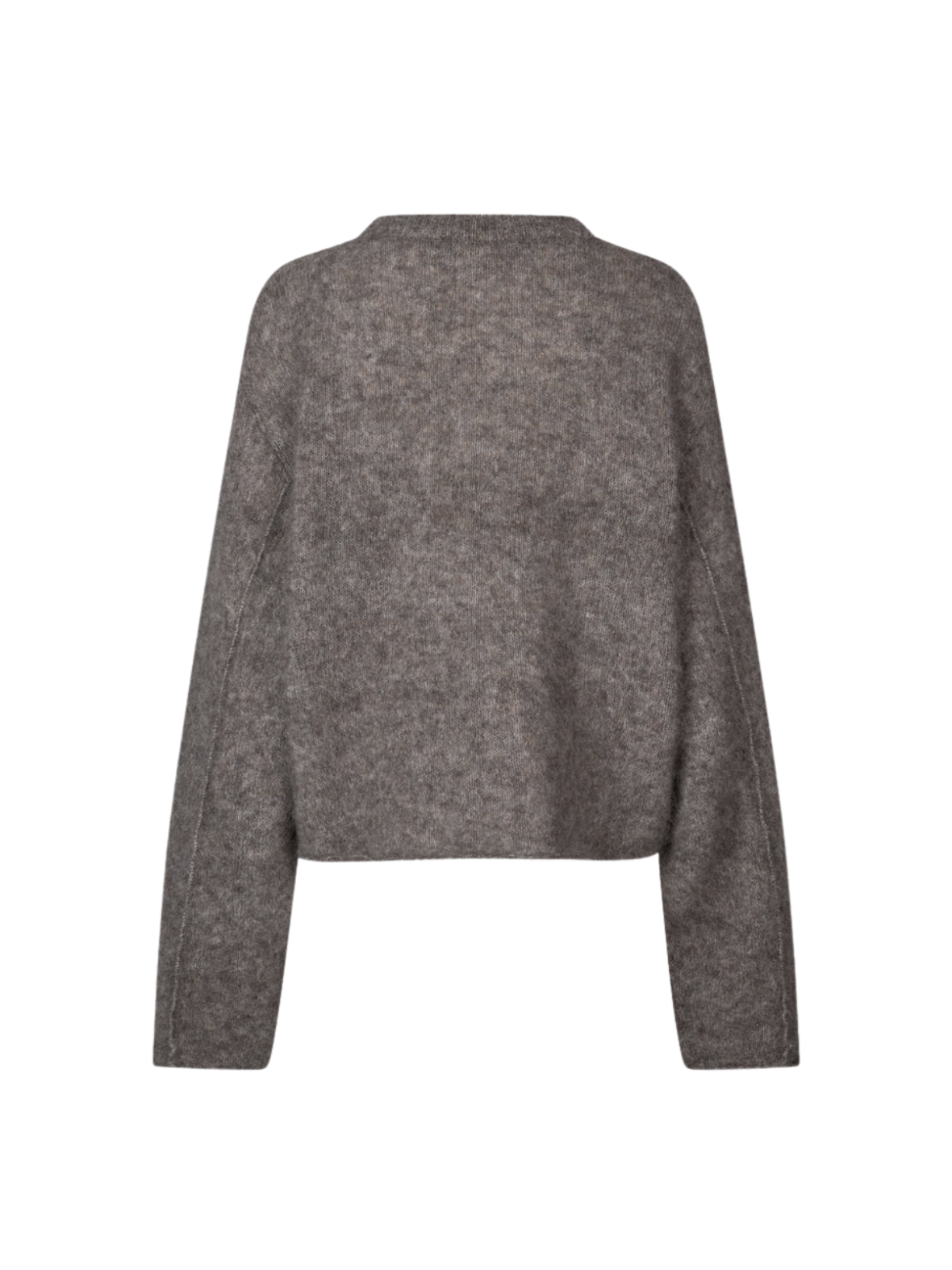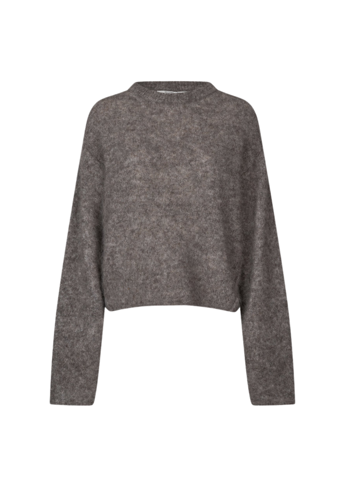 Denne grå striktrøje har et minimalistisk og tidløst design med en let cropped pasform. Den bløde kvalitet og runde hals gør den både behagelig og alsidig. Perfekt til lag-på-lag styling – brug den over en skjorte for et elegant look eller sammen med jeans og støvler for en afslappet hverdagsstil.