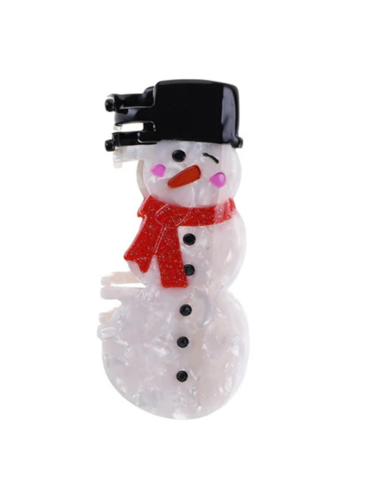 Denne søde hårklemme formet som en snemand bringer et festligt og legende touch til vinterens frisurer. Med sin røde glitrende halstørklæde og sorte hat emmer den af julestemning. Perfekt til at samle håret på en hyggelig decemberdag eller som et sjovt accessorie til julefrokosten.
