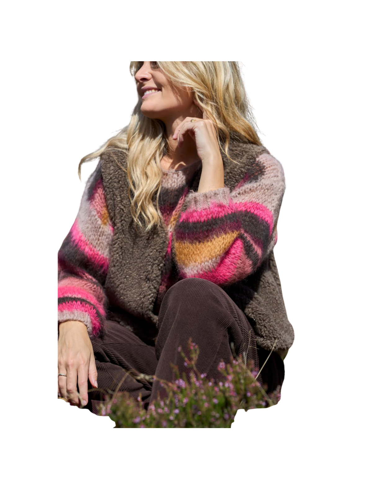 Denne farverige striktrøje bringer varme og personlighed til din garderobe med sine flotte striber i pink, brun, beige og gyldne nuancer. Den luftige mohairblanding giver et blødt og let udtryk, perfekt til både kølige dage og hyggelige aftener.