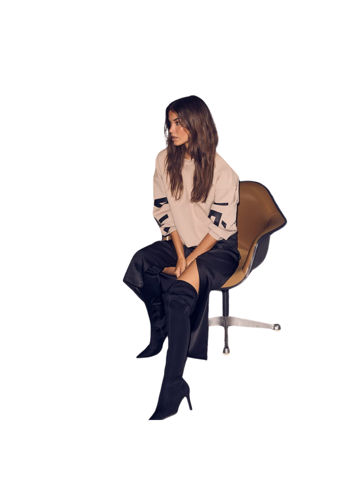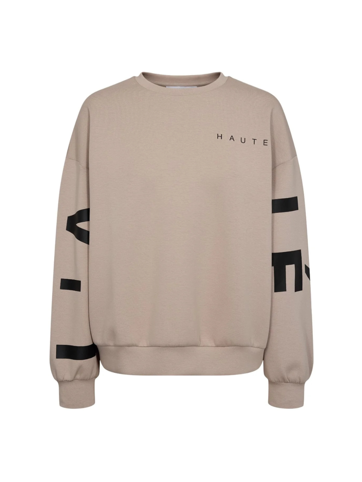 Denne beige sweatshirt har et minimalistisk og cool udtryk med sort logoprint på brystet og ærmerne. Den har en afslappet pasform og blød kvalitet, der gør den perfekt til hverdagsbrug. Style den med jeans og sneakers for et casual look eller med en lang nederdel for en moderne kontrast.