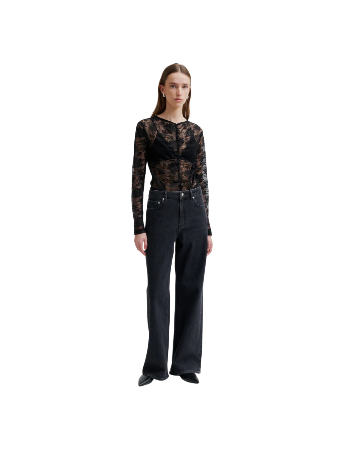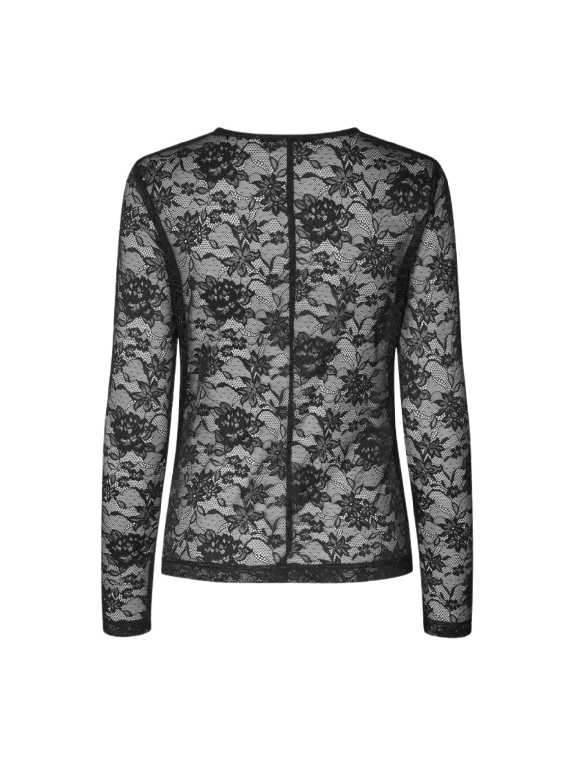 Denne sorte blondebluse giver et feminint og sofistikeret udtryk med sit transparente design og tætsiddende pasform. Det lette blondemateriale tilføjer et elegant touch, perfekt til både hverdag og aften. Style den med højtaljede jeans og støvler for et cool look, eller med en nederdel og hæle til en mere festlig anledning.