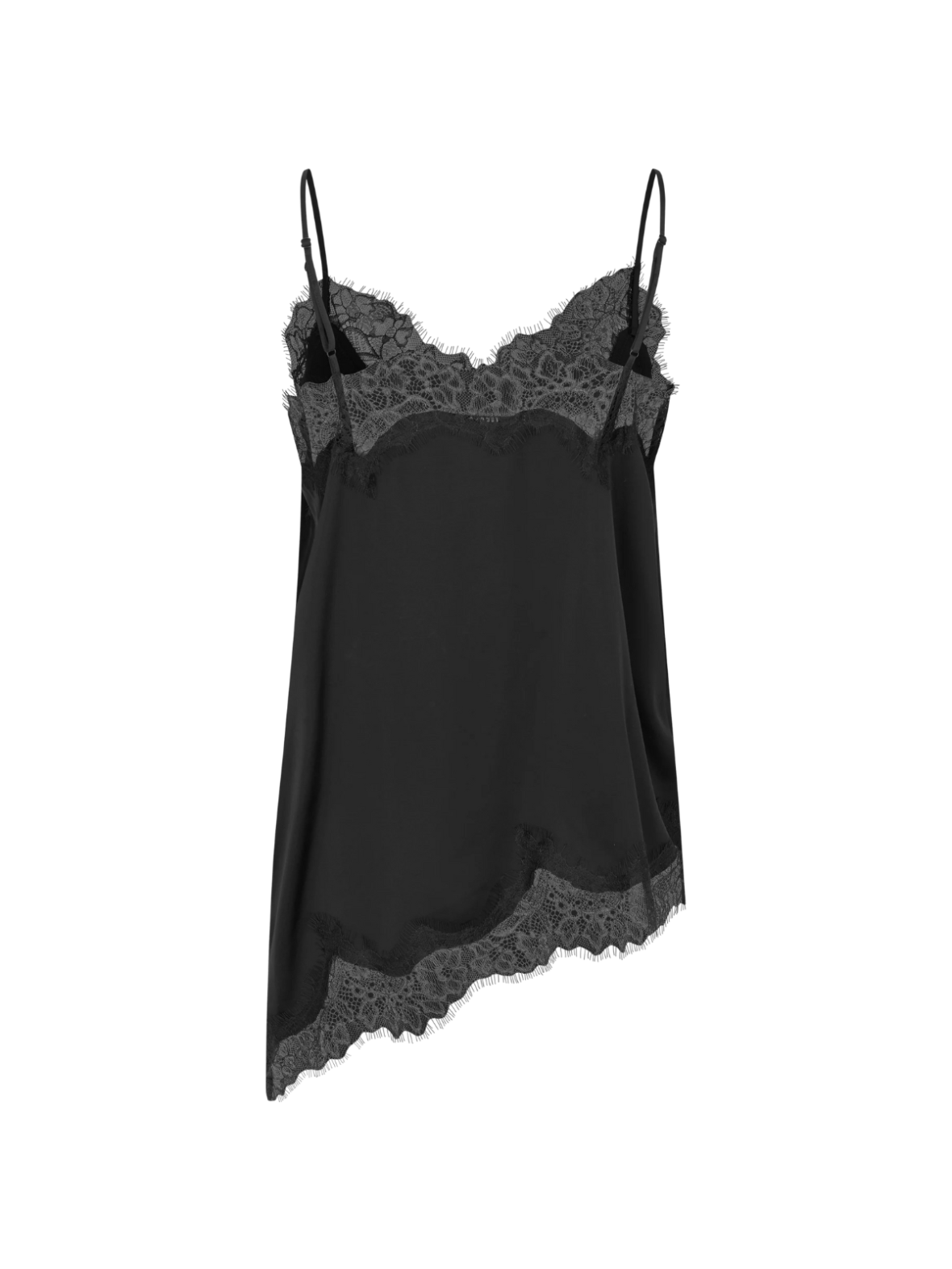 Sort top i let og elegant kvalitet med fine blondekanter. Modellen har smalle, justerbare stropper og en feminin V-udskæring med blonder, der også går igen langs kanten forneden. Den asymmetriske afslutning giver et eksklusivt og moderne udtryk.