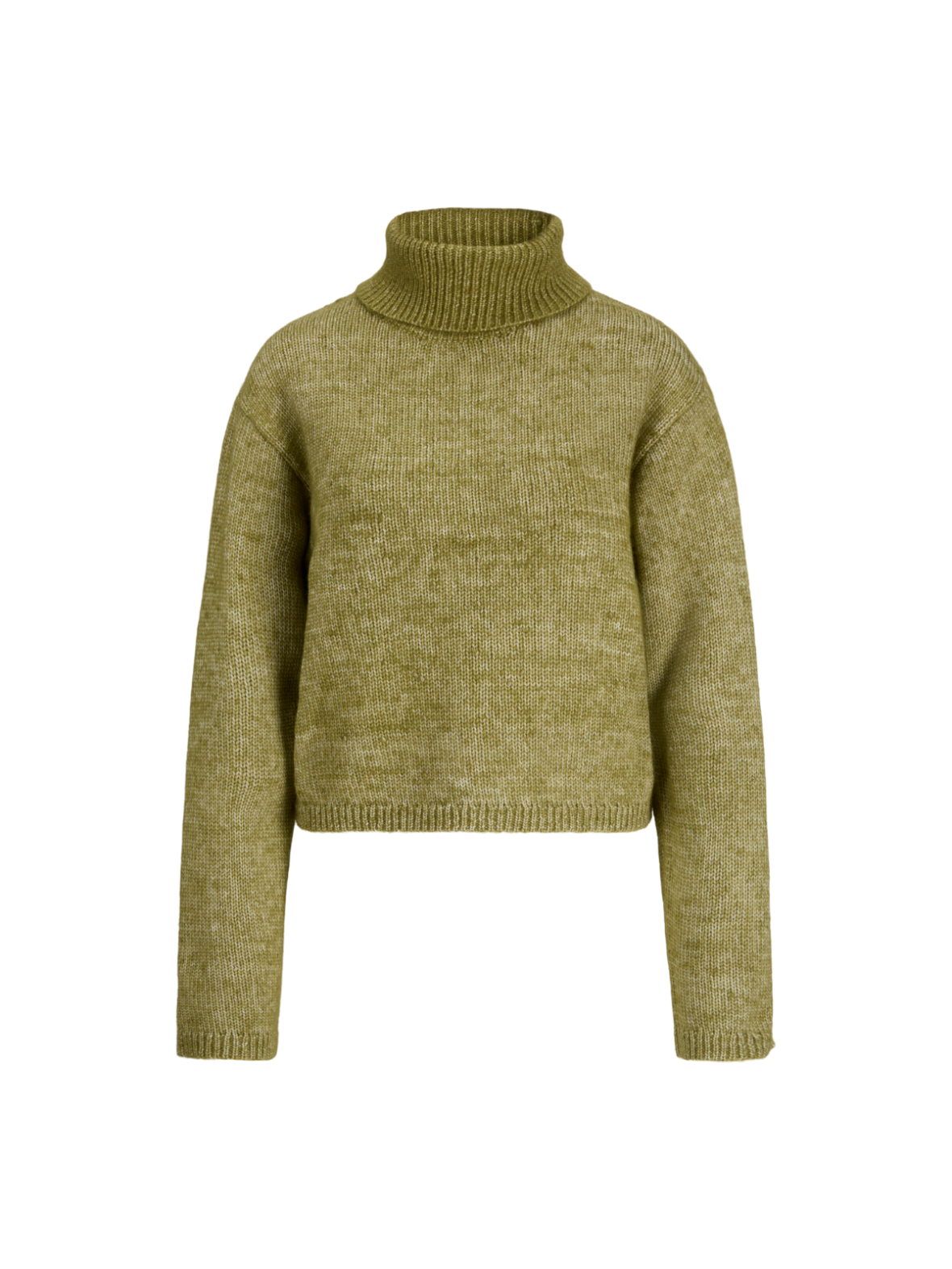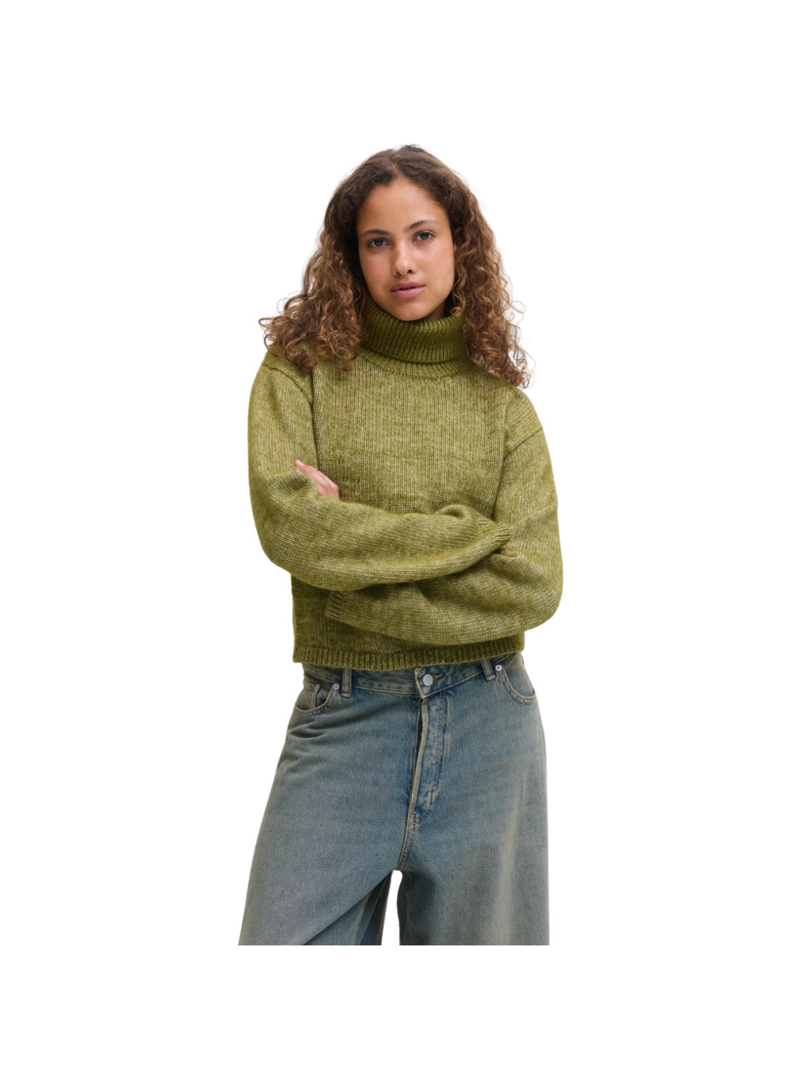 Denne grønne rullekravestrik er både varm og stilfuld – perfekt til sæsonens kølige dage. Den har en blød, let meleret struktur og en afslappet pasform, som giver et hyggeligt, men moderne look. Style den med jeans og støvler for et casual hverdagsoutfit, eller med en nederdel og frakke for et mere elegant udtryk.