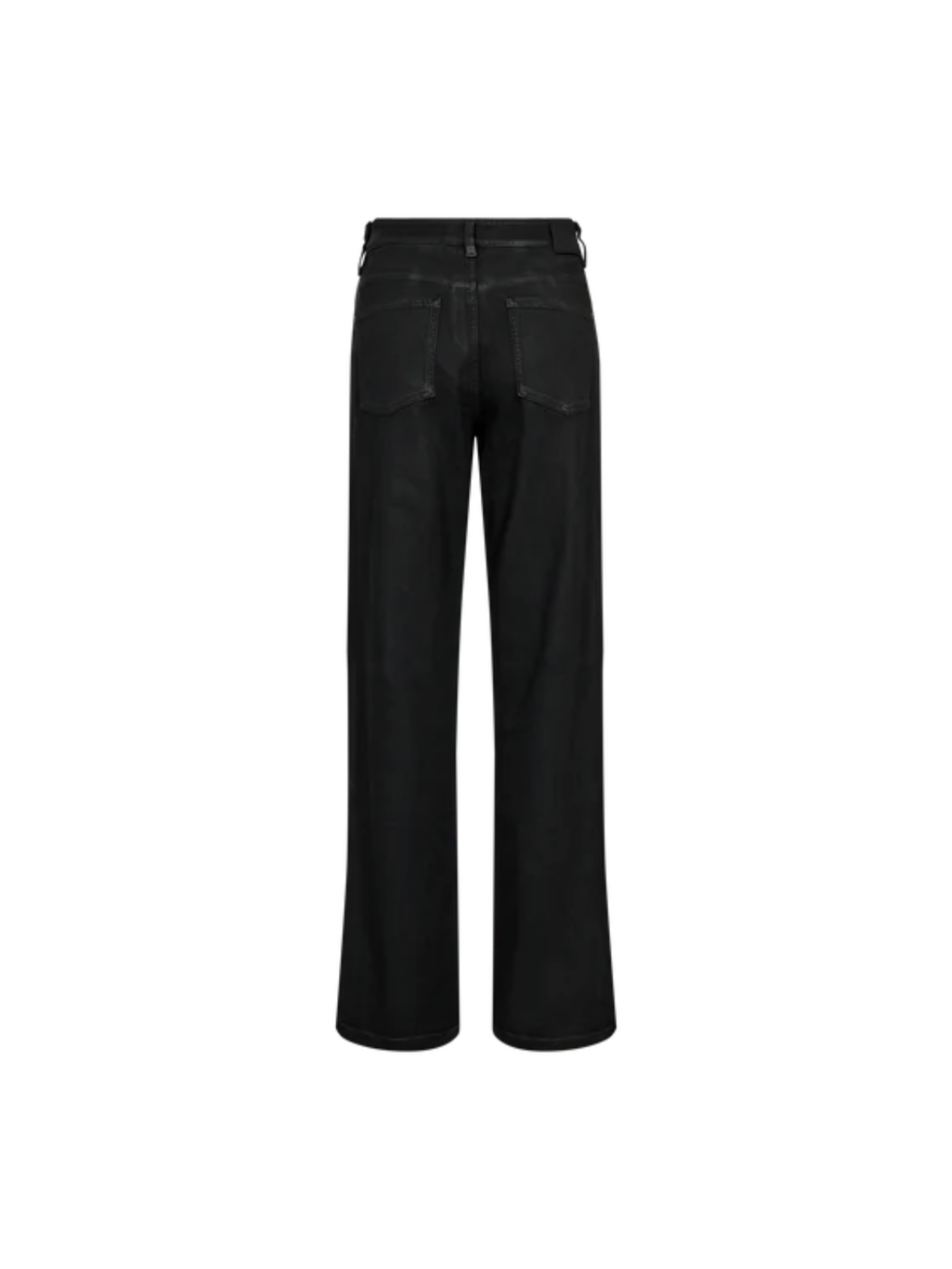 Disse sorte bukser har et cool og moderne udtryk med deres coatede finish, der giver et læderlignende look. Den høje talje og lige ben skaber en flatterende silhuet, perfekt til både hverdags- og aftenbrug.
