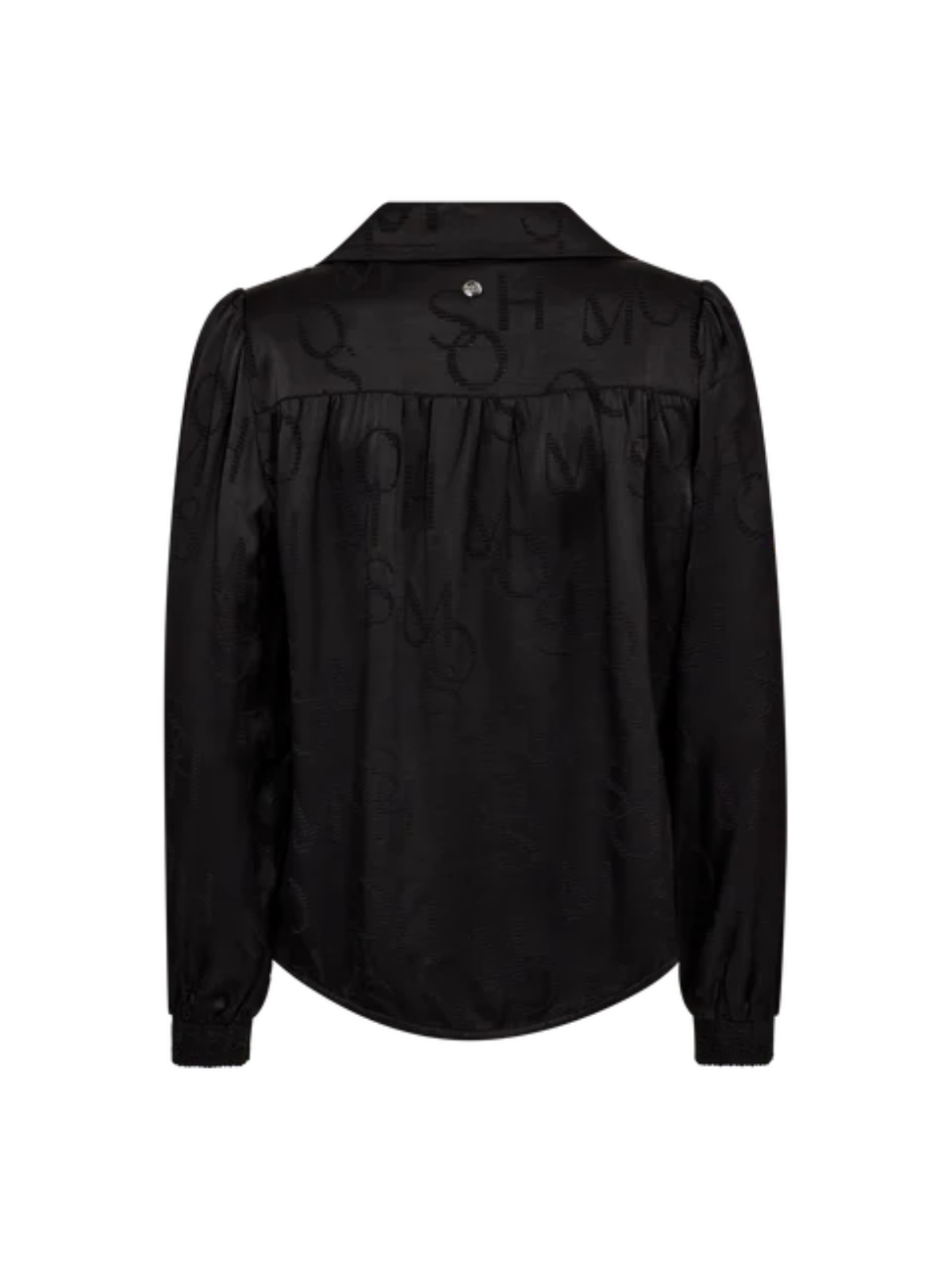 Denne sorte Mos Mosh bluse er et elegant og moderne valg med et eksklusivt udtryk. Blusen er designet i et let og glansfuldt materiale med et diskret all-over monogram, der tilfører et sofistikeret og stilfuldt look uden at være prangende.