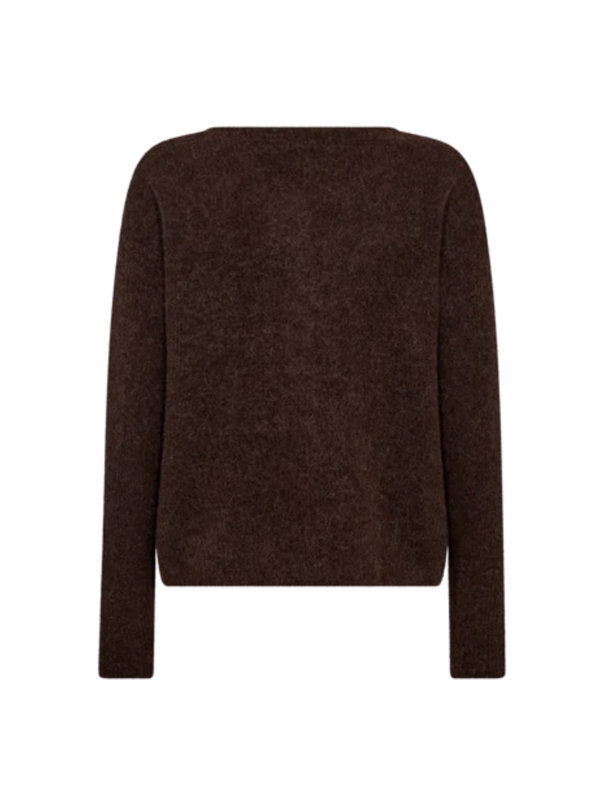 En blød og klassisk strikcardigan i en varm brun nuance. Cardiganen har rund hals, gennemknapning foran og lange ærmer. Pasformen er enkel og tidløs, hvilket gør den nem at style både lukket som en striktrøje eller åben over en top eller skjorte.
