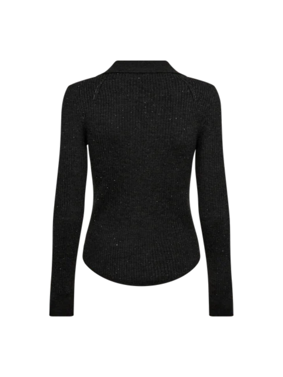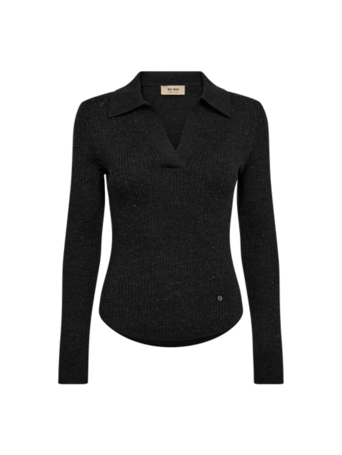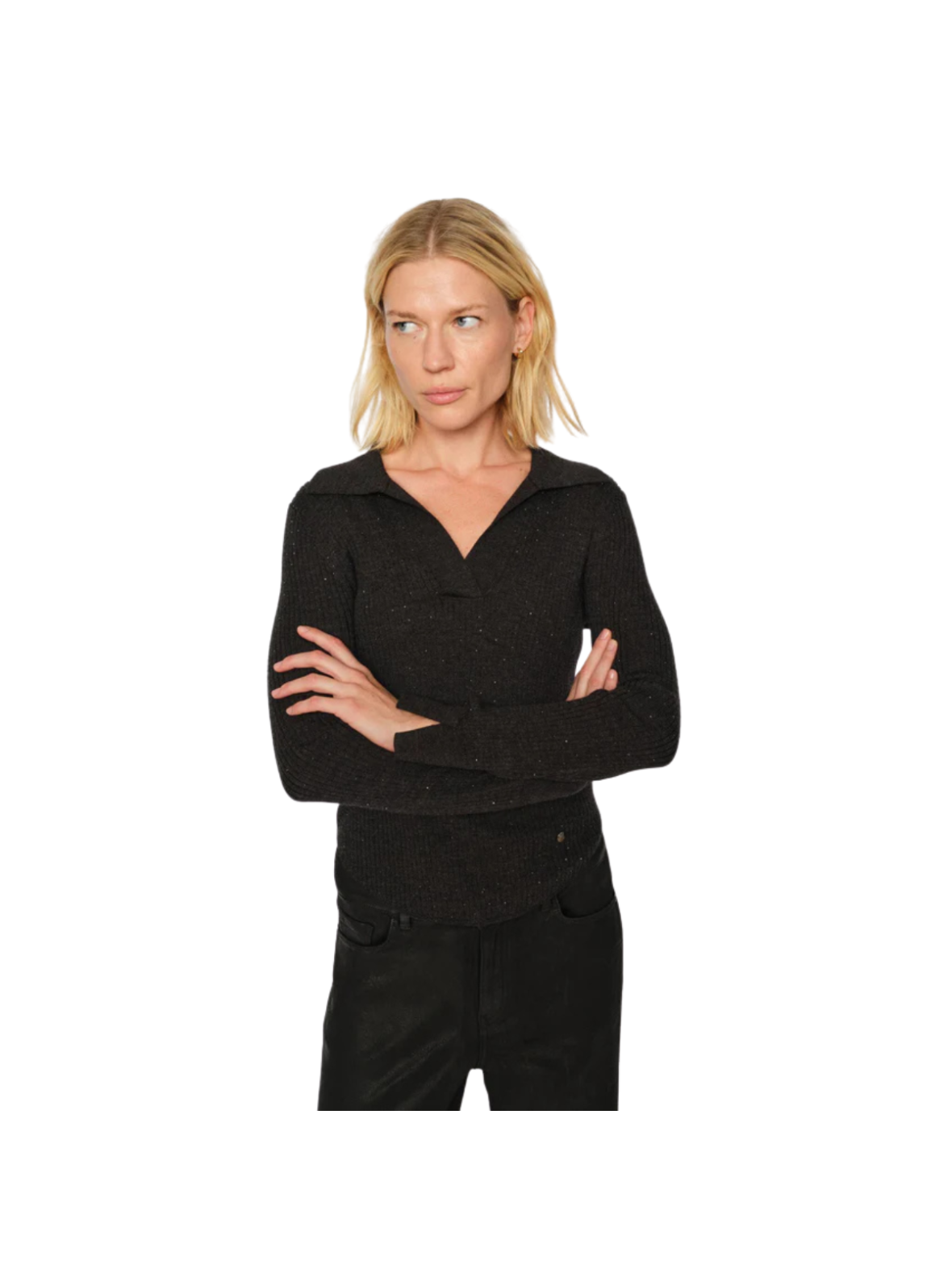 En elegant sort strikbluse med polokrave og v-udskæring, der giver et feminint og sofistikeret udtryk. Blusen har lange ærmer og en tætsiddende pasform, som fremhæver silhuetten. Den fine strikkvalitet gør den både behagelig at have på og nem at style.