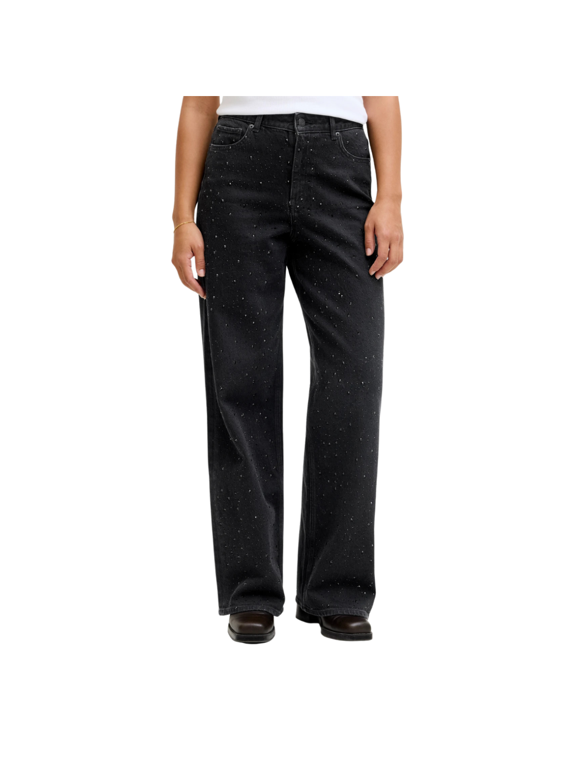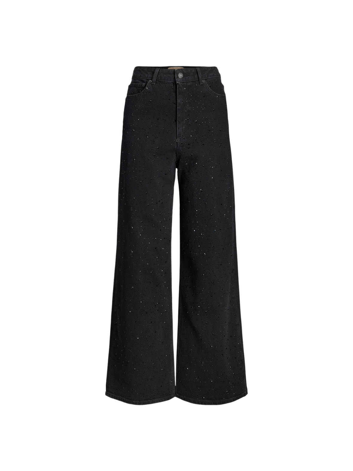 Statement wide leg jeans i sort denim med fine glitrende sten, der giver et eksklusivt og iøjnefaldende udtryk. Den høje talje og de brede ben skaber en flatterende silhuet med et moderne twist. Style dem med en enkel top og hæle for et elegant aftenlook, eller kombinér med sneakers og strik for en cool hverdagsvibe. Et par jeans, der løfter enhver garderobe med kant og glamour.