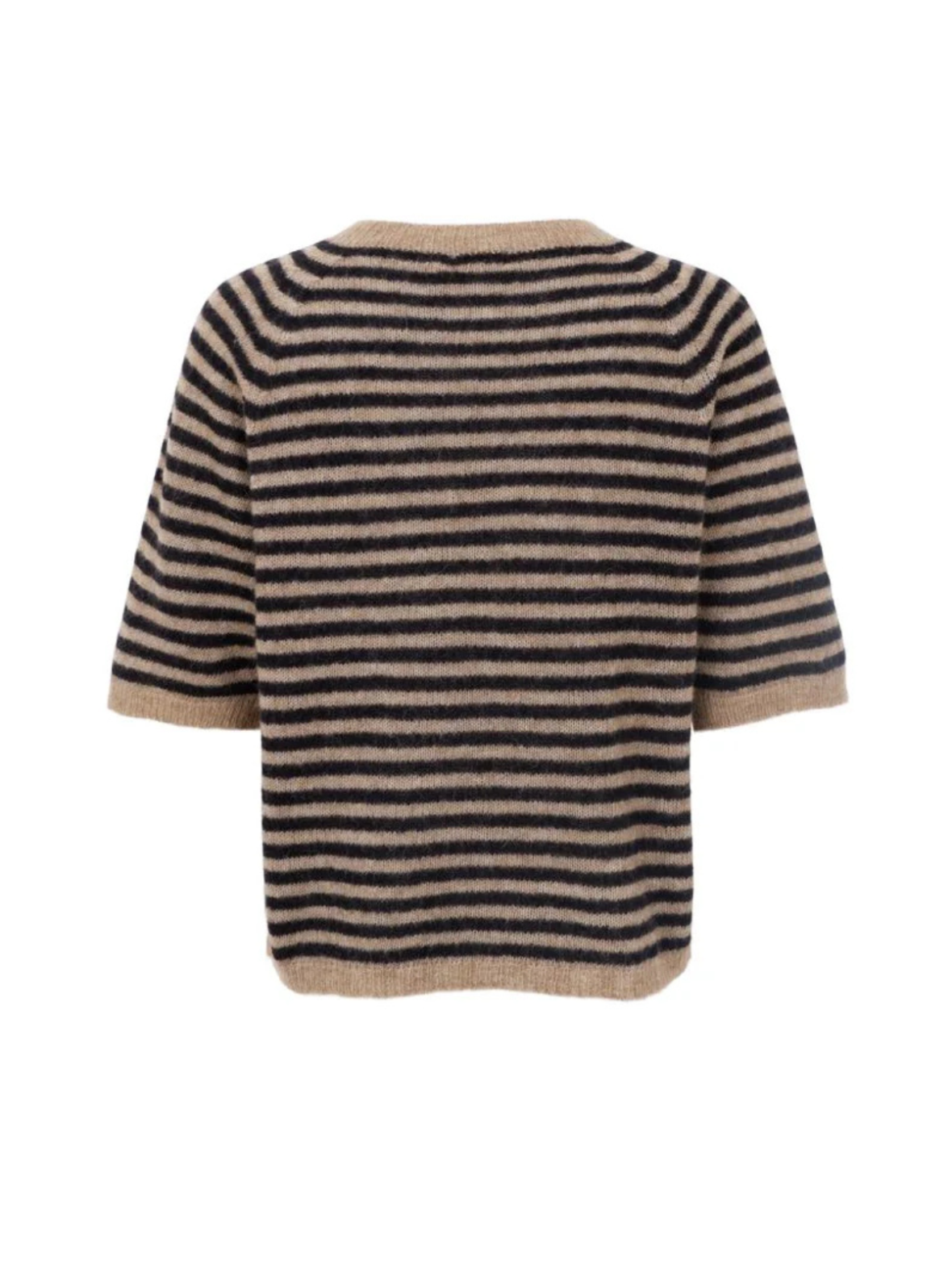 Denne strikkede bluse med korte ærmer har et klassisk og tidløst look med sine sorte og beige striber. Den bløde kvalitet gør den behagelig at have på, og den lette pasform gør den ideel til både overgangssæsoner og layering.