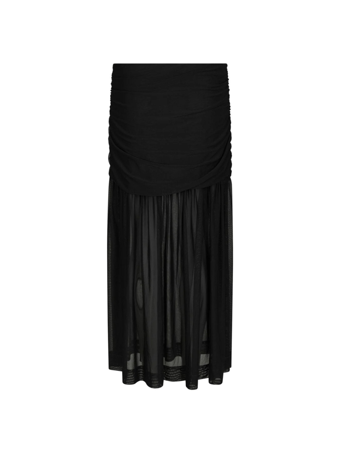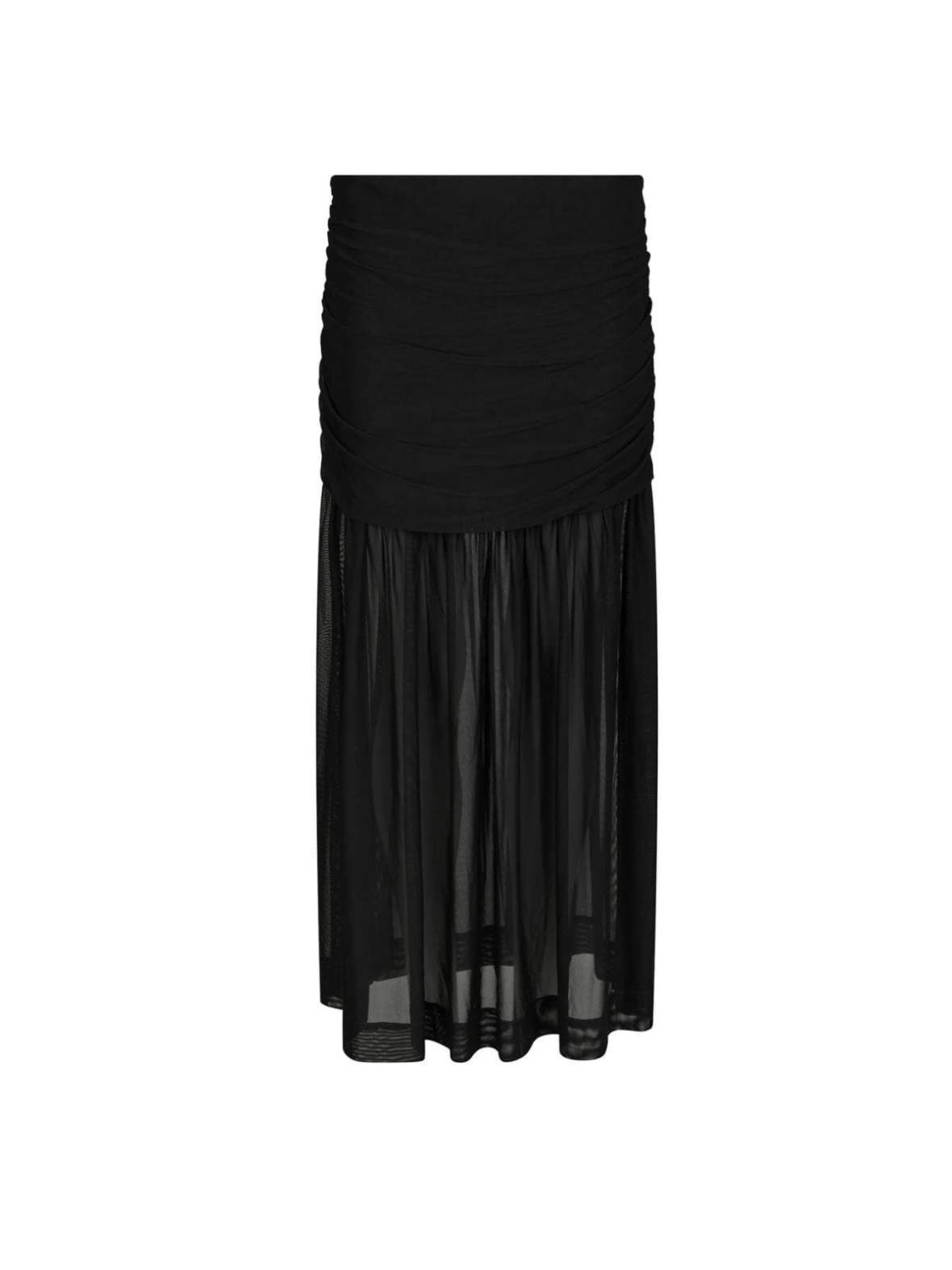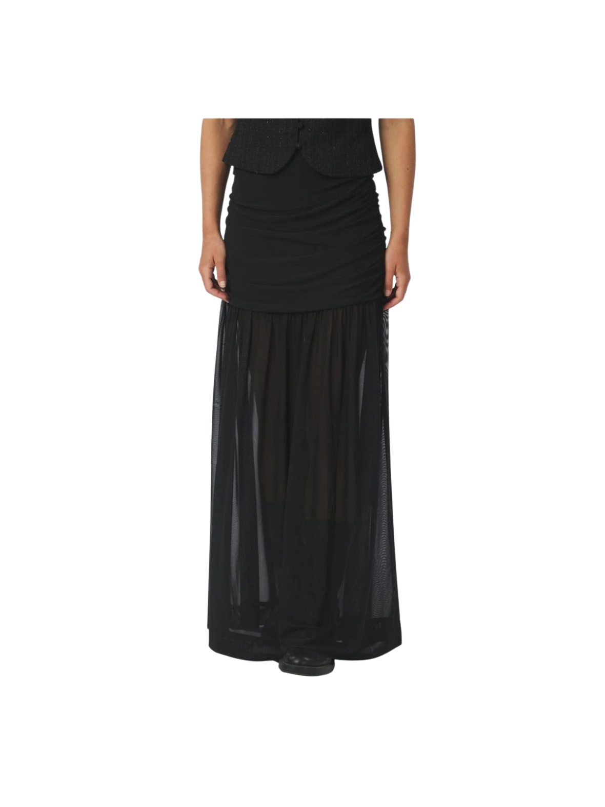Denne sorte maxinederdel skaber et moderne og dramatisk look med sin kombination af en tætsiddende, rynket overdel og et langt, gennemsigtigt mesh-lag. Den giver et cool, lag-på-lag udtryk, som både er edgy og elegant.