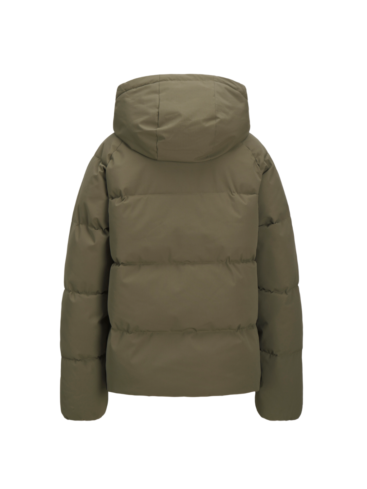 Denne armygrønne pufferjakke kombinerer et cool, sporty look med maksimal komfort. Den bløde, quiltede konstruktion og høje hætte giver effektiv varme og beskyttelse mod vinterkulden. Jakken har et enkelt, moderne udtryk, der gør den nem at style til både jeans, leggings og strik.
