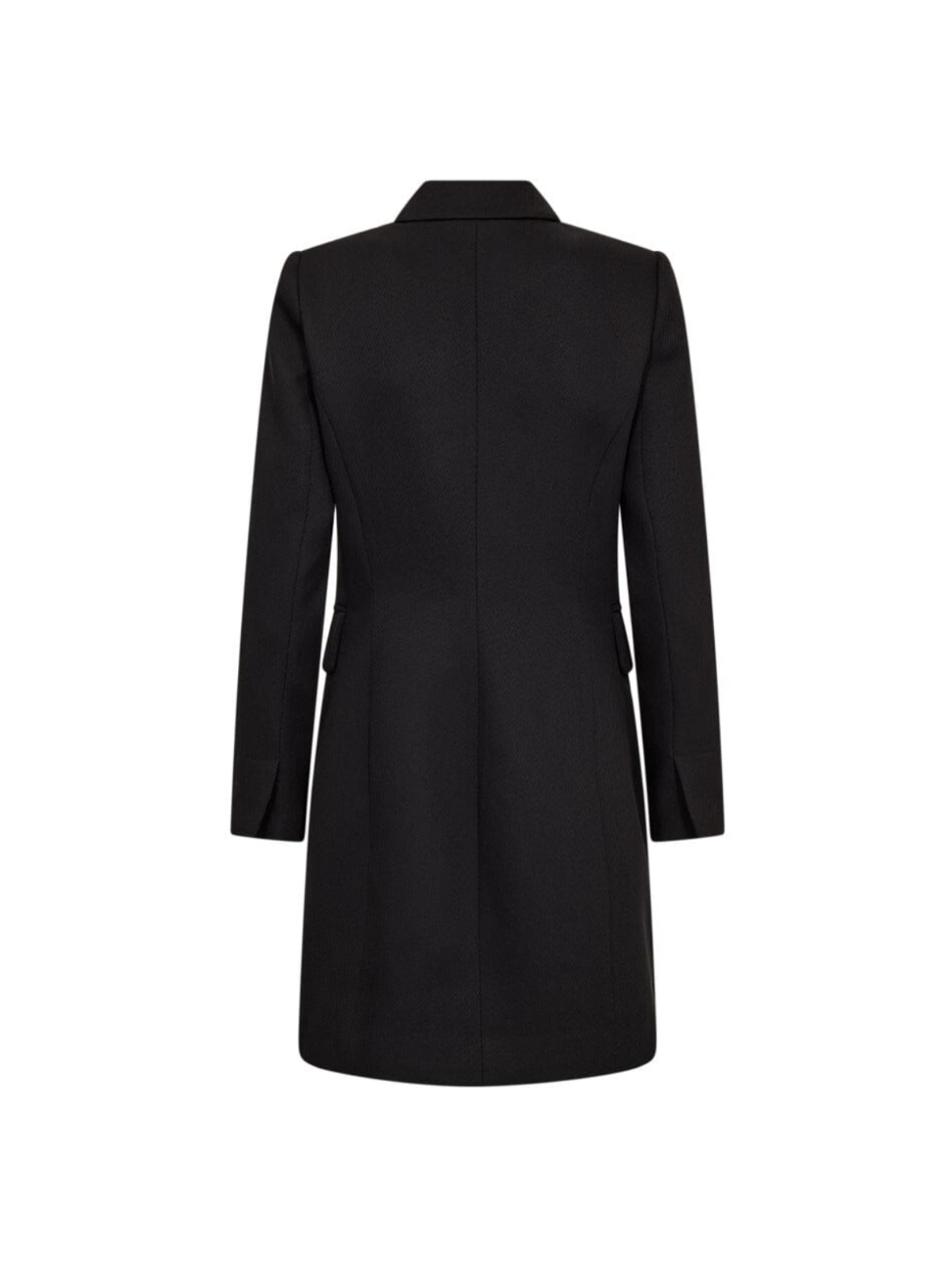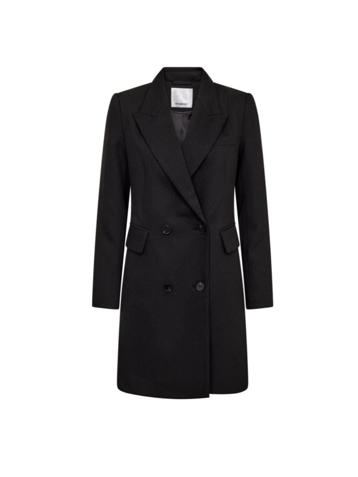 Denne sorte blazer-kjole kombinerer klassisk elegance med et moderne, feminint snit. Den dobbeltradede lukning og skarpe revers giver et sofistikeret udtryk, mens pasformen fremhæver figuren på en flatterende måde. Perfekt til både kontor og aftenbrug