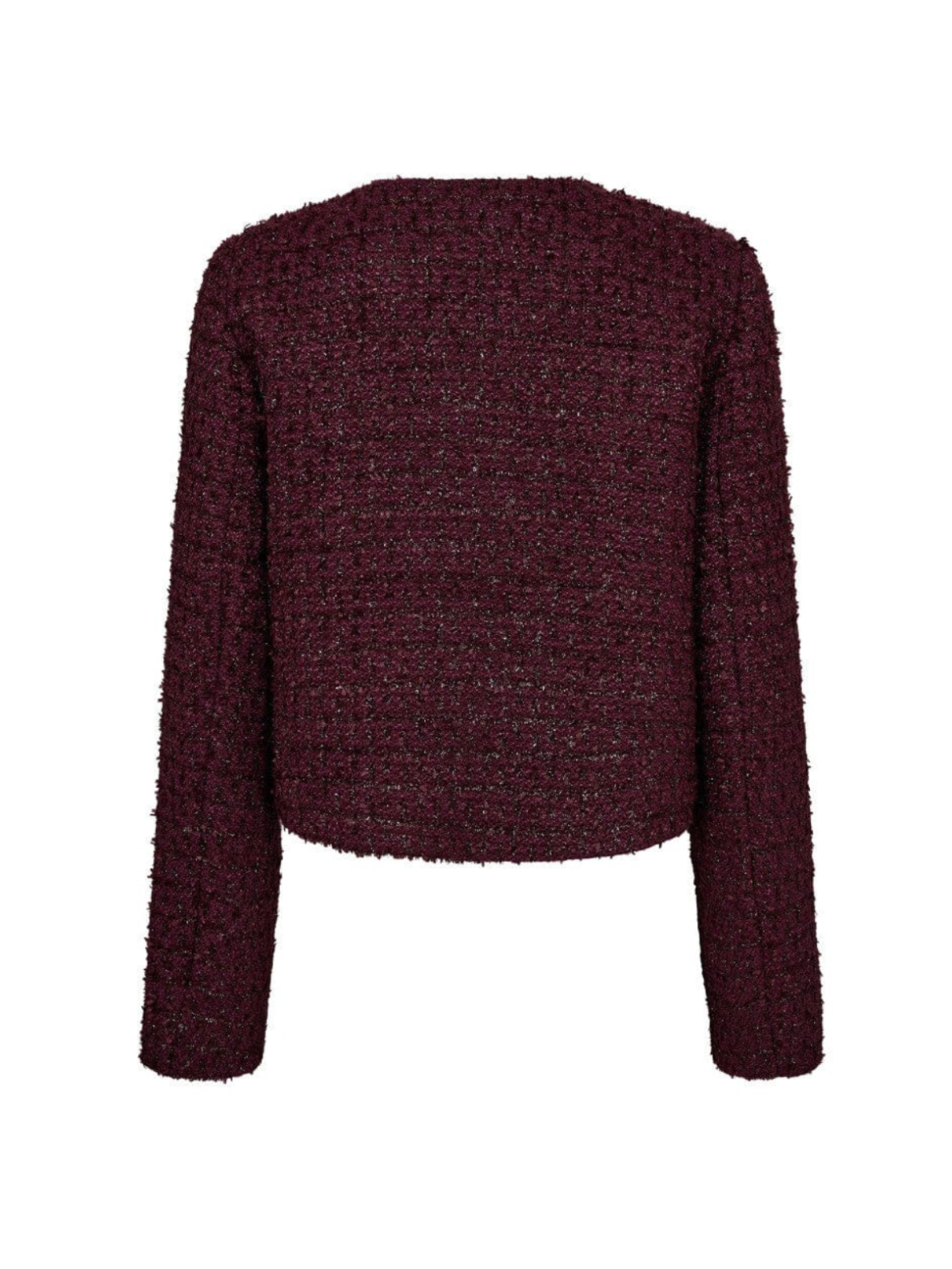 Denne elegante bouclejakke i dyb bordeaux kombinerer klassisk stil med moderne detaljer. Det strukturerede materiale og de dekorative knapper giver et eksklusivt udtryk. Den korte pasform gør den perfekt til både bukser og nederdele.