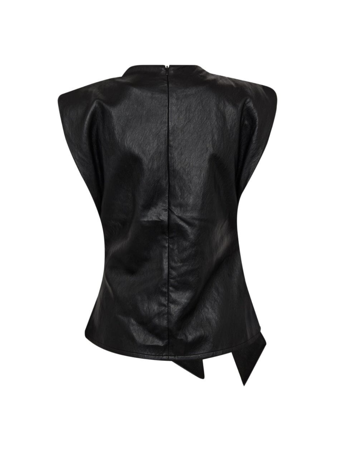 Denne sorte top i imiteret læder udstråler kant og elegance på samme tid. Den har et flatterende draperet snit og et bindebånd i taljen, som fremhæver figuren. Perfekt til både festlige lejligheder og et cool hverdagslook.