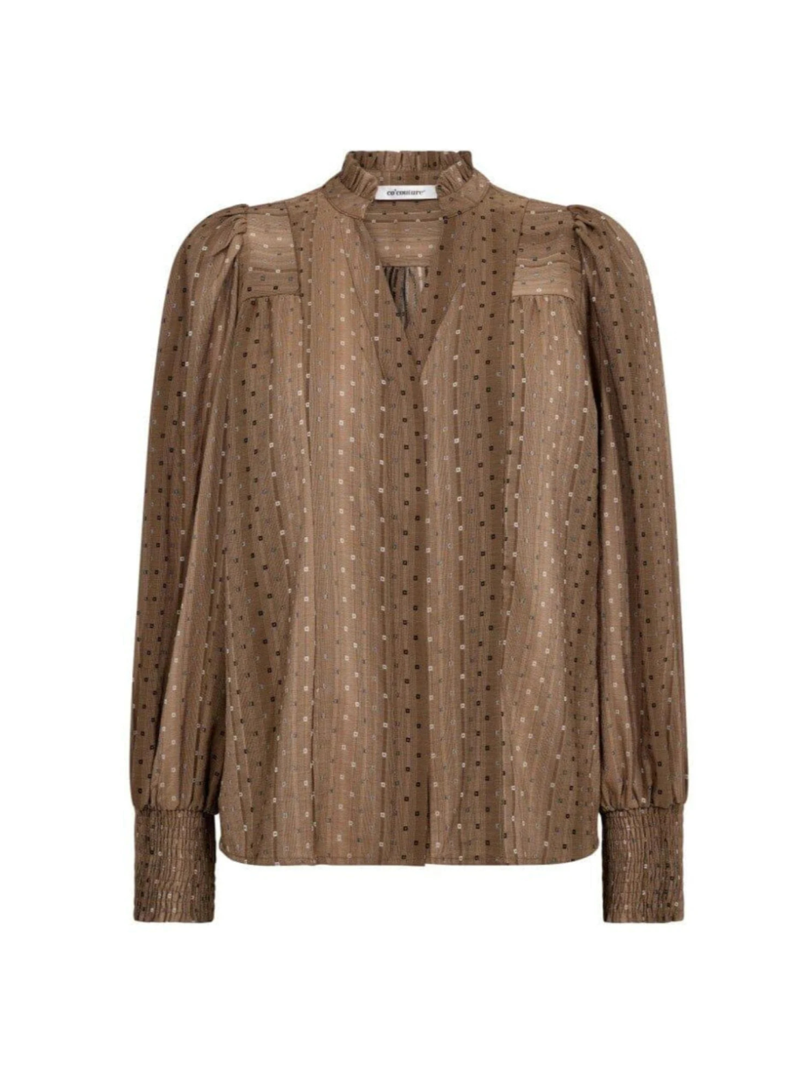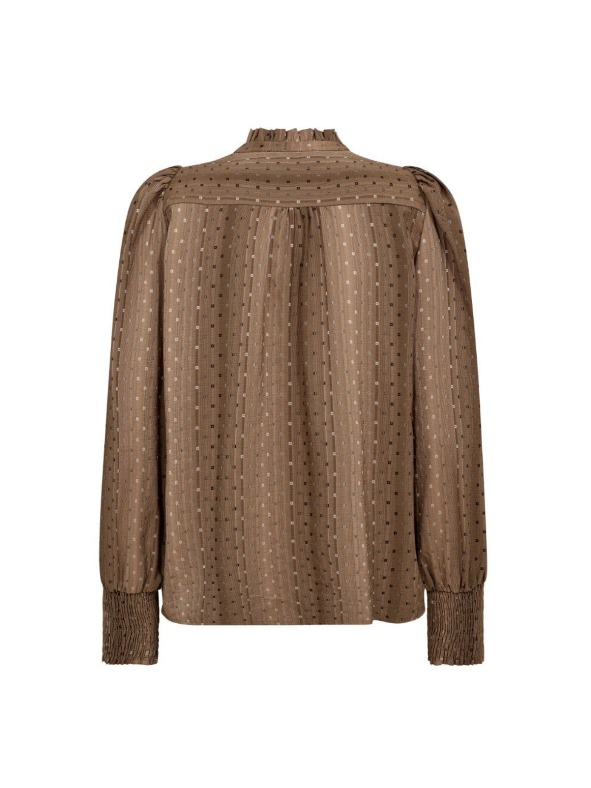 Denne elegante bluse i varm brun nuance har et let, glitrende mønster, der giver et sofistikeret udtryk. De fine detaljer som den lille flæsekrave, V-udskæring og smockmanchetter tilføjer et feminint touch