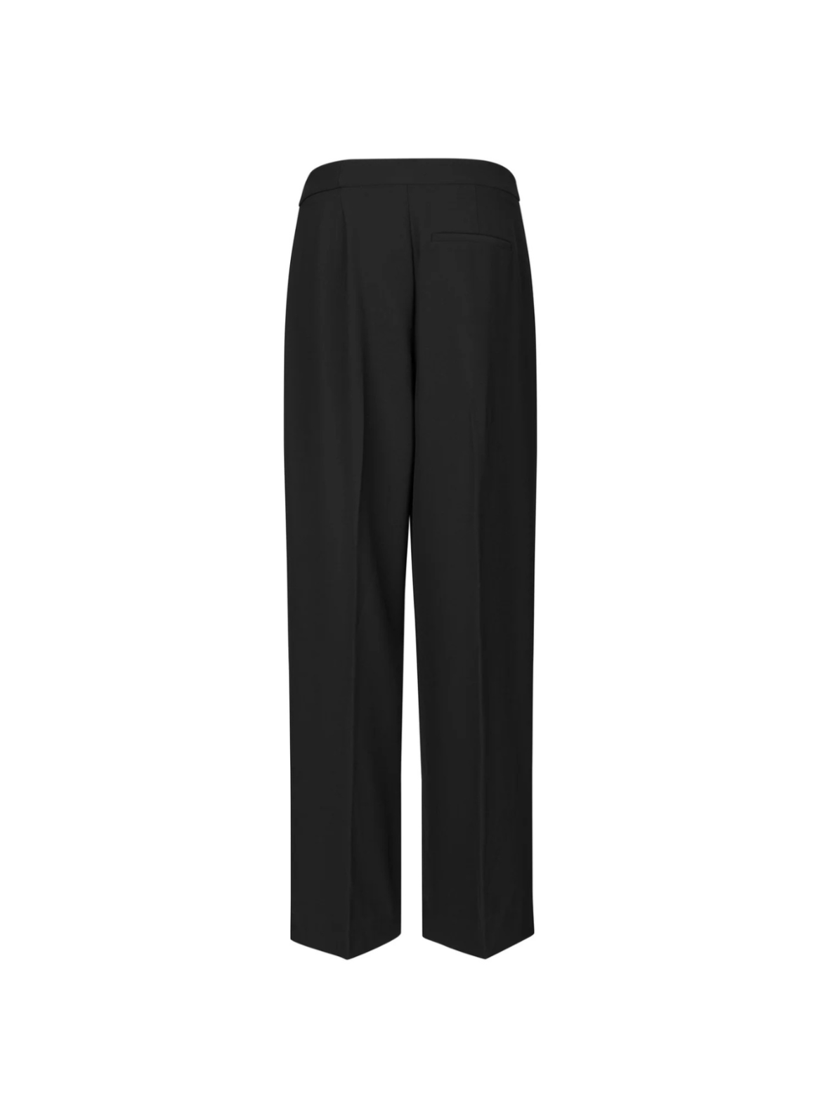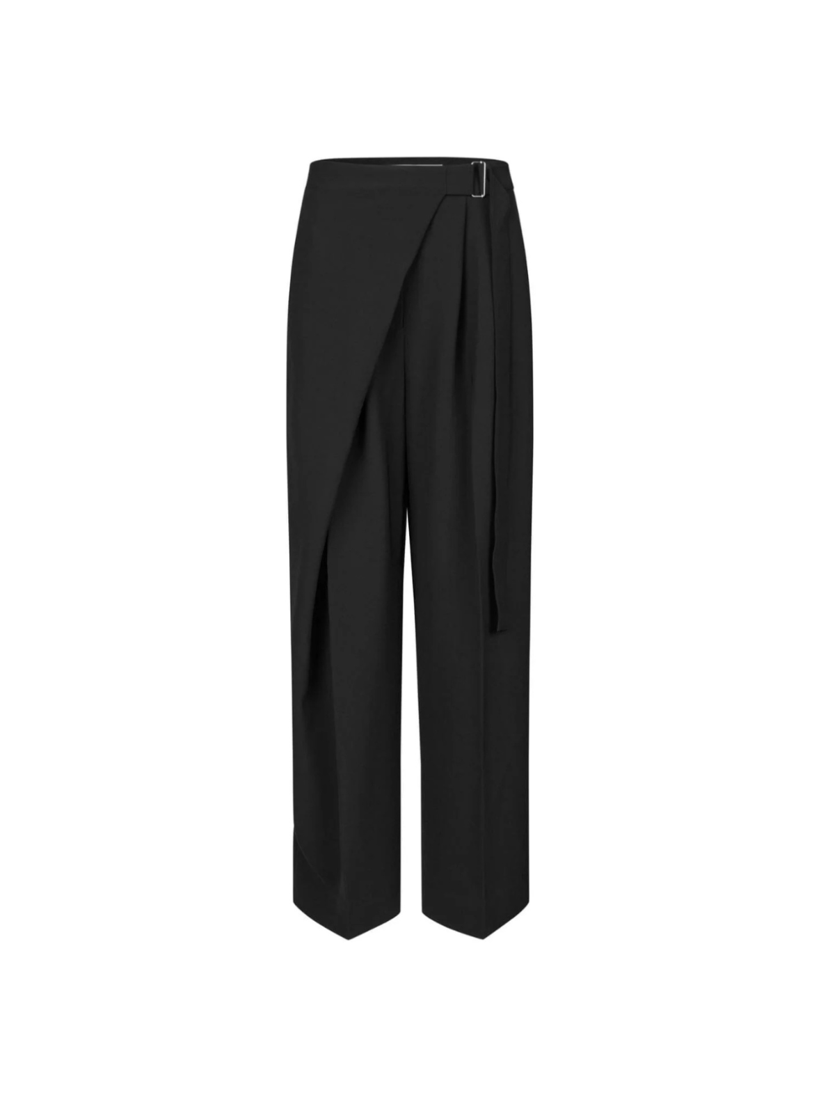 Disse sorte bukser har et elegant og moderne wrap-design, der skaber en smuk og unik silhuet. Den brede benform giver et eksklusivt fald, mens spændedetaljen i taljen tilføjer et sofistikeret twist. Perfekte til både kontor og fest